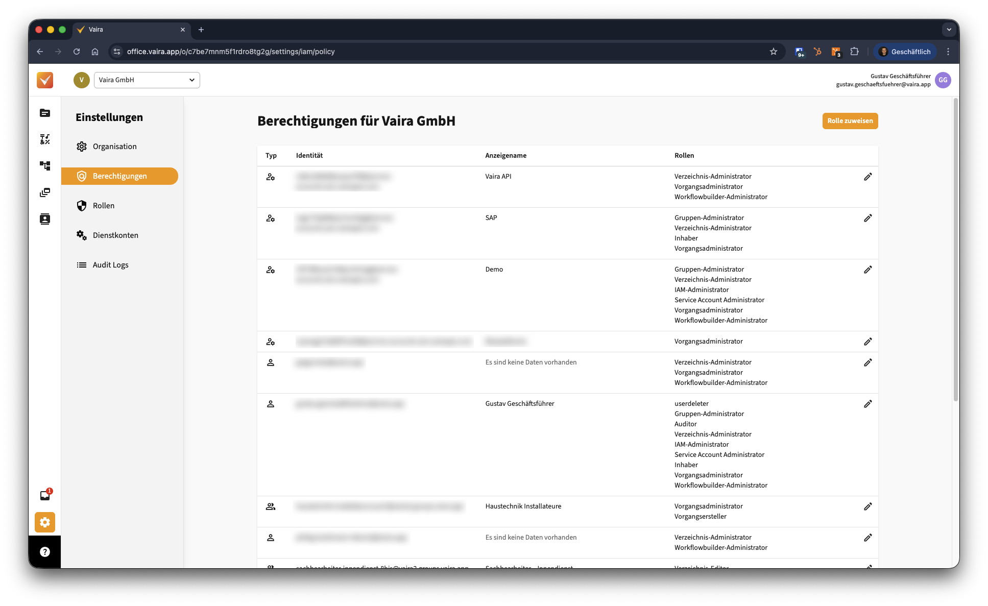 Einer der wichtigsten Wege, Datenverlust durch unabsichtliche Löschung zu vermeiden, ist die Konfiguration von Rollen und Berechtigungen. Die Einstellungen hierfür können nur User vornehmen, die Zugriff auf Rollen und Berechtigungen haben – also mindestens dein Account-Admin von Vaira, gegebenenfalls aber auch noch weitere Personen je nach eurer Konfiguration.