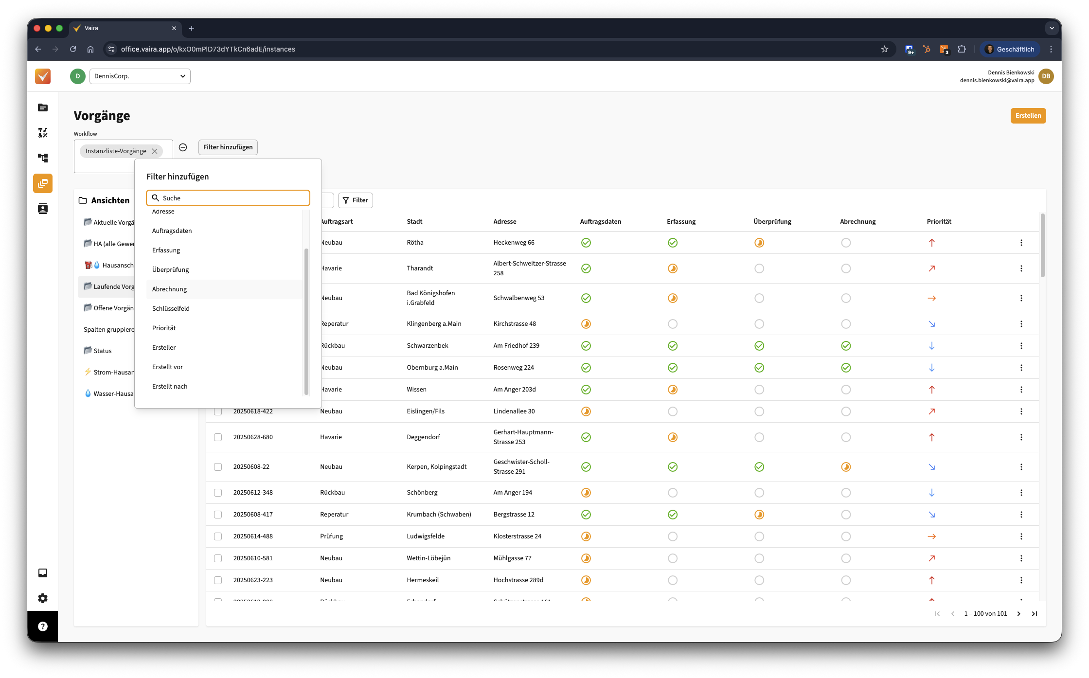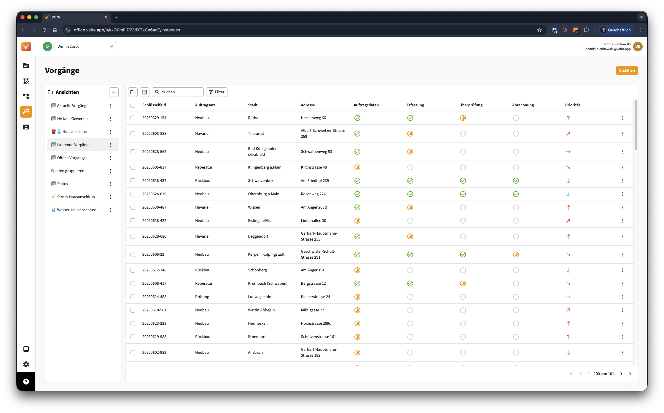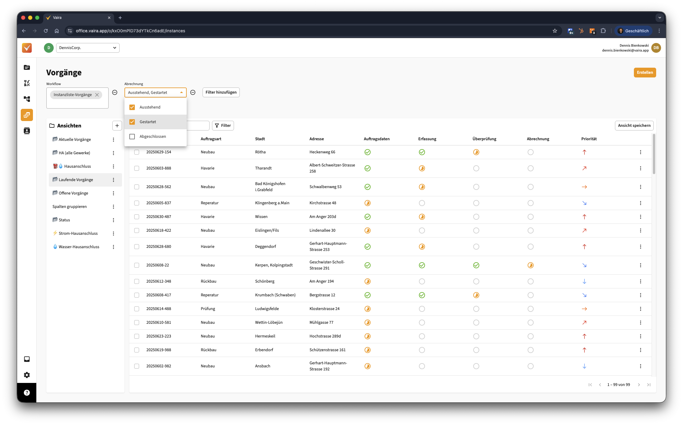 Wie du Ansichten erstellst, erfährst du in dieser Anleitung: Wie kann ich eine Ansicht im Vaira Office erstellen und bearbeiten? - Deine Vorgangsliste sieht dann z.B. so aus, ausgestattet mit einigen Feldern als Spalten und mehreren Statusspalten. Wichtig dabei mit "Abrechnung" als einer Spalte der Vorgangsliste: