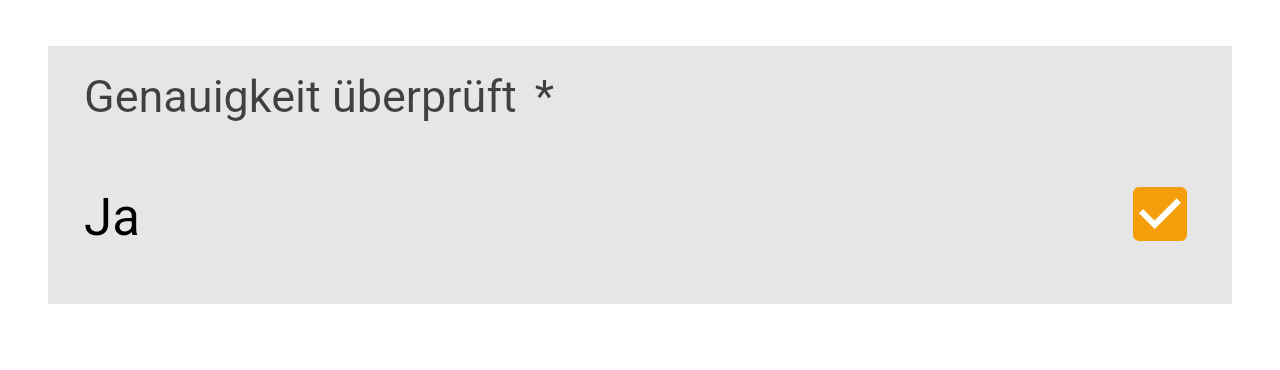 Das Checkbox-Feld dient dem einfachen Abhaken von Einträgen. Links oben siehst du den Namen der Box (hier "Genauigkeit überprüft"), der zum Beispiel auch eine Frage („Muffe eingepackt?”) sein kann. Mit einem Klick auf das Kästchen rechts setzt du einen Haken in das Feld.