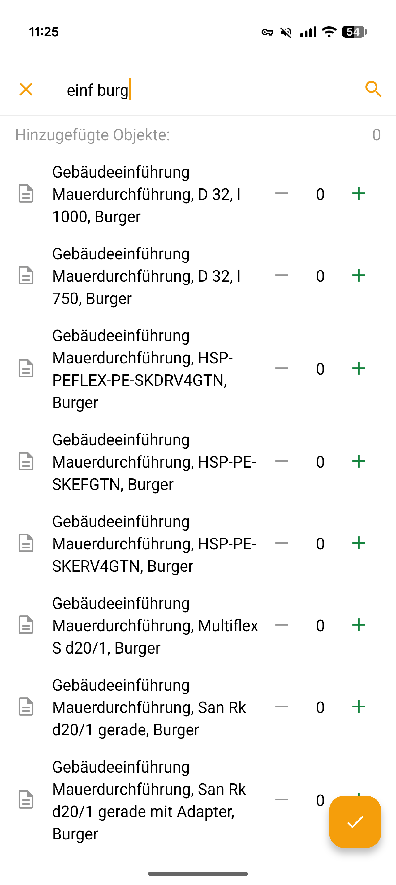 Hier kannst du oben über das Lupe-Symbol wieder ein Eingabefeld fürs Suchen und Filtern öffnen – entweder mit ganzen Worten oder mit einem oder mehreren Wortbestandteilen. Rechts neben jedem Verzeichnisobjekt kannst du per + oder  einstellen, wie viele von diesem Objekt zu deiner Vorgangsliste hinzugefügt werden sollen. Wenn du alles ausgewählt hast, bestätigst du deine Eingaben über den Haken-Button unten rechts.