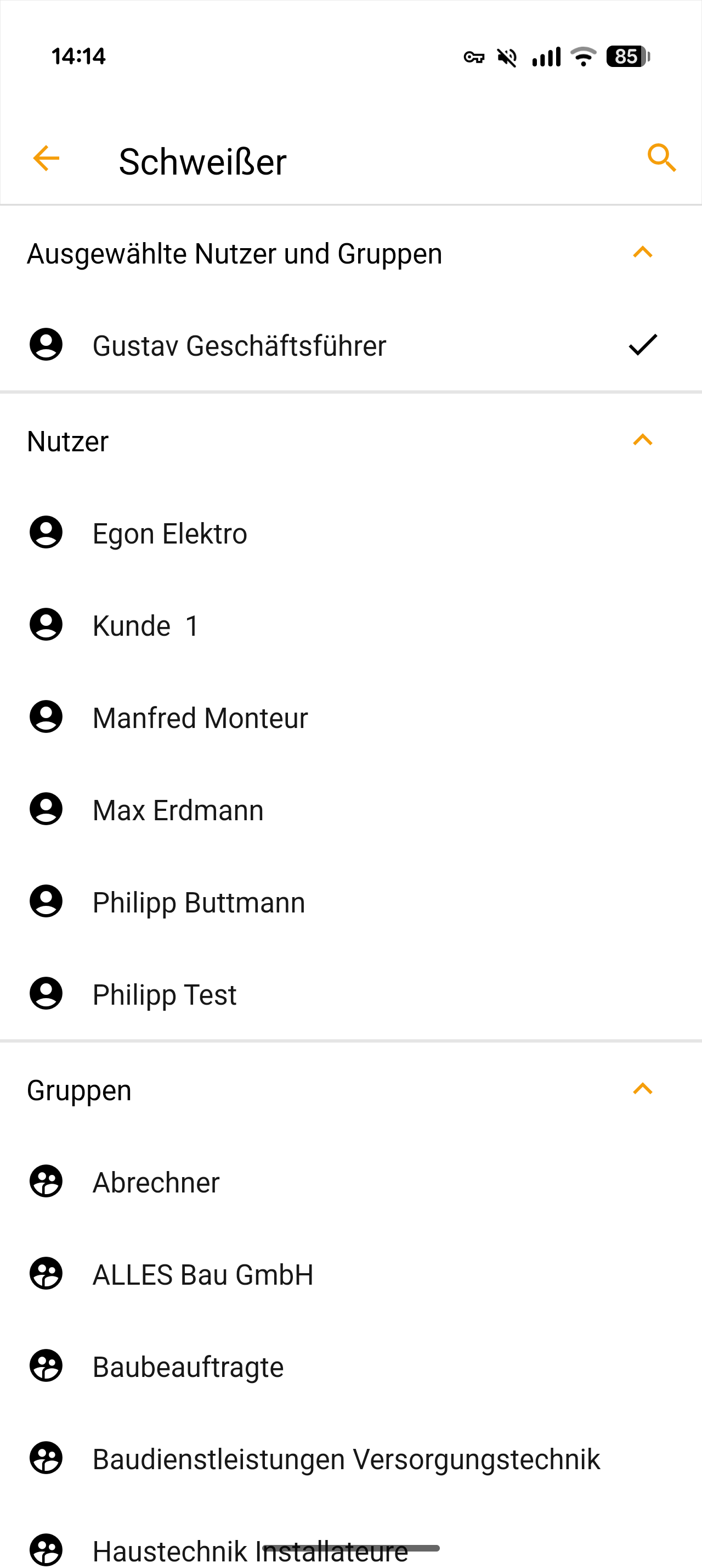 Das Feld Benutzer erlaubt es dir, Personen, Gruppen oder Organisationen auszuwählen. Wenn du auf das Personen-Icon rechts klickst, öffnet sich ein Fenster, in dem du die gewünschten Personen, Gruppen oder Organisationen auswählen kannst. Über das Lupe-Symbol oben rechts kannst du die Liste auch filtern nach ganzen Worten oder einem oder mehreren Wortbestandteilen.