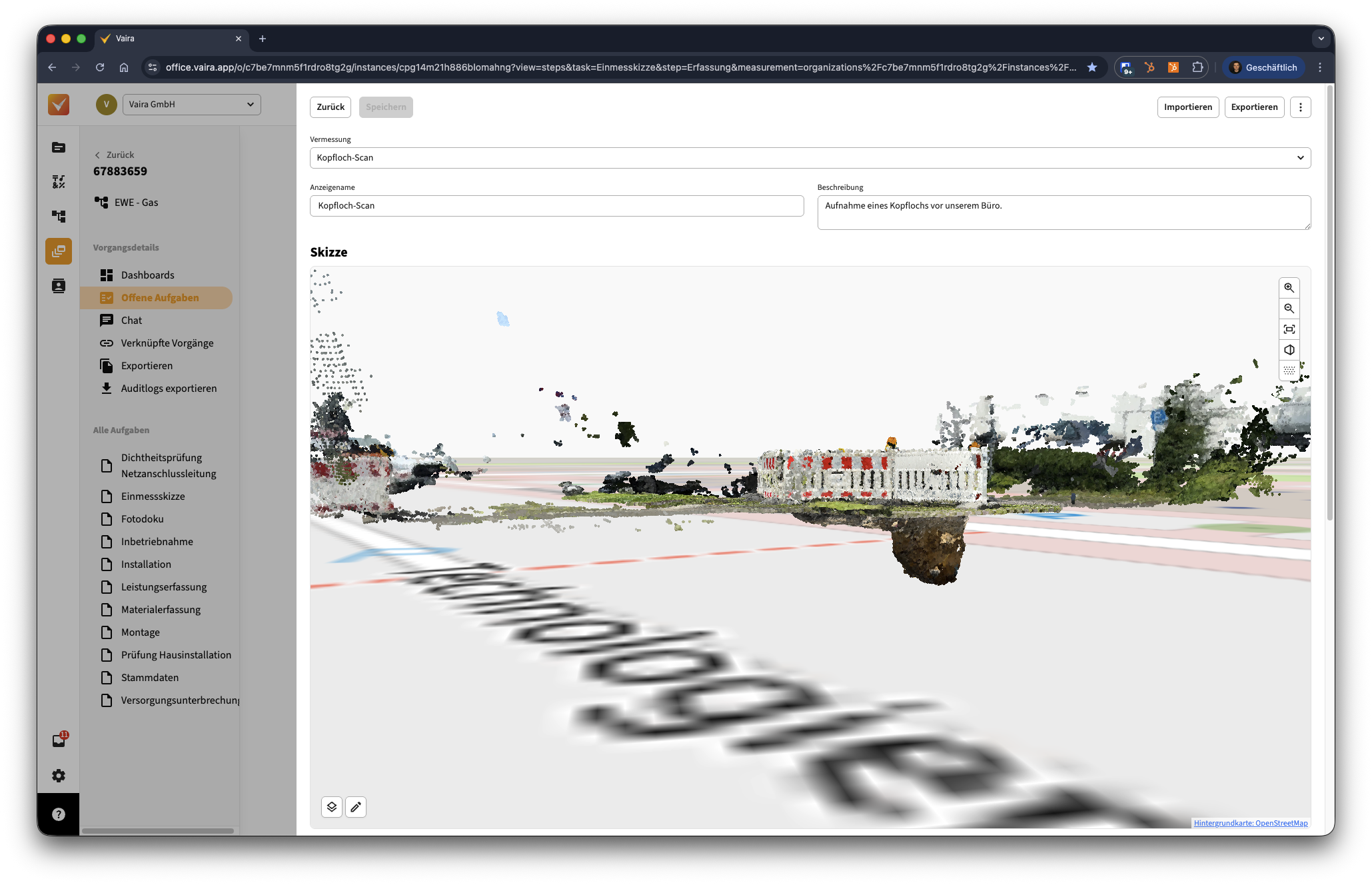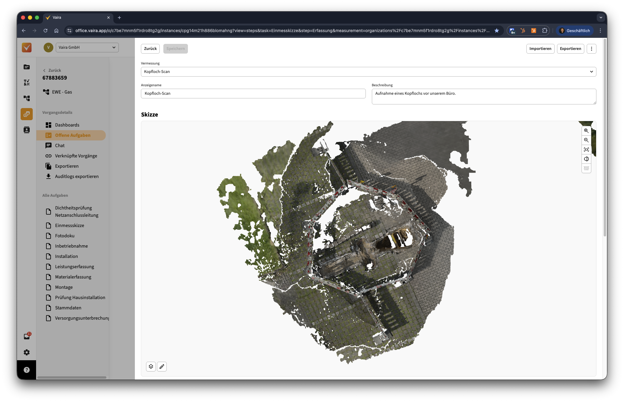 Im Vaira Office hast du die Möglichkeit, deine 3D-Scans anzusehen und in ihnen weiterzuarbeiten. Das kannst du sowohl in Form der Punktwolken-Rohdaten als auch an berechneten 3D-Mesh-Objekten deiner Vermessungen.