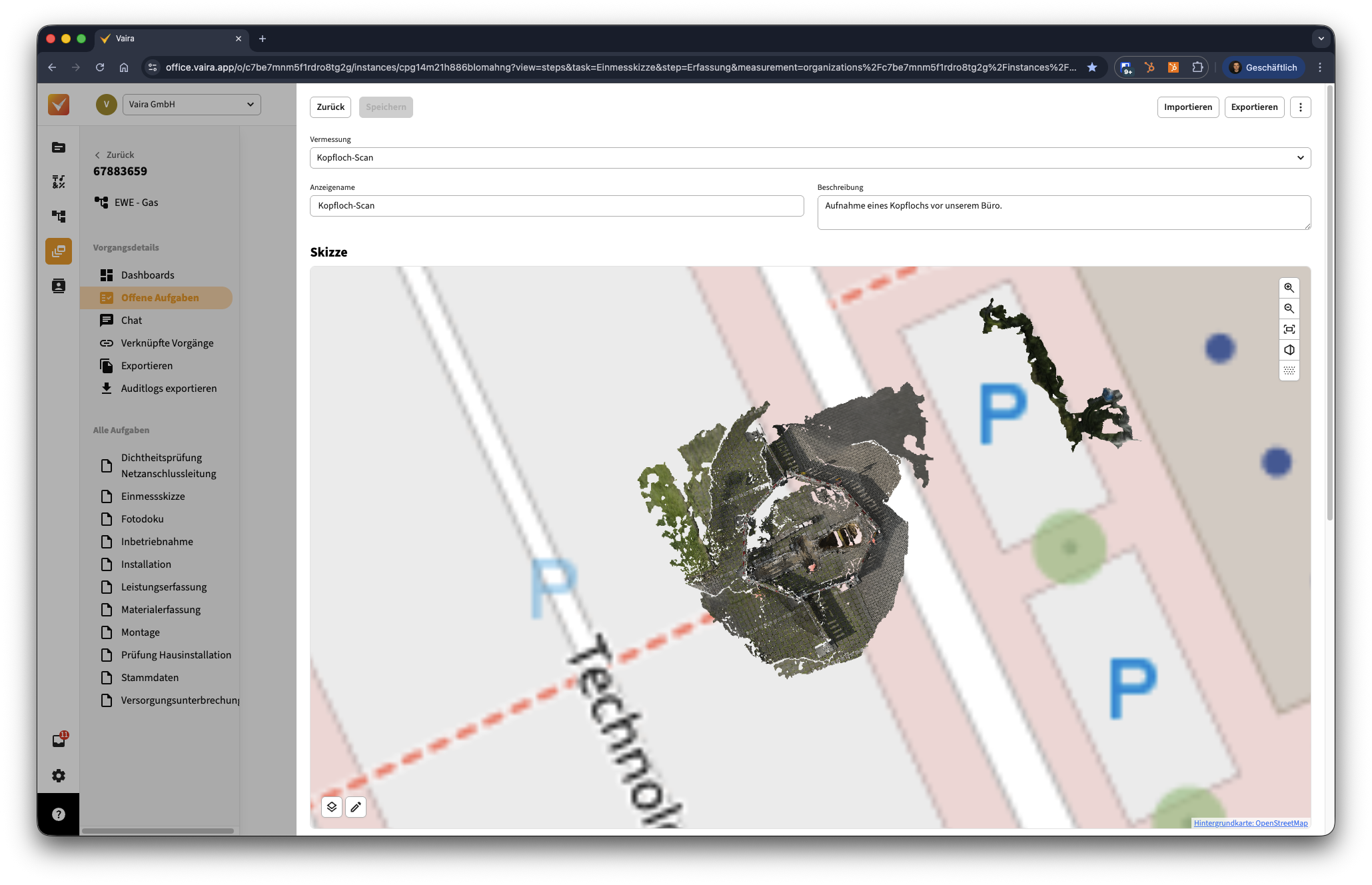 Wichtig: 3D-Modelle können aus relativ großen Datenmengen bestehen. Daher kann es einen Moment dauern, bis dein 3D-Modell geladen ist. Solange siehst du im oberen Teil der Vermessungsansicht einen Hinweis, dass das Modell gerade geladen wird. - Dein 3D-Modell wird immer absolut positioniert. Falls du die 3D-Erfassung ohne RTK-Antenne durchgeführt hast, nutzt Vaira dein Geräte GPS und kann die Vermessung – je nach GPS-Empfang – auf ca. 10 Meter genau auf der Welt verorten. Mit RTK kommst du auch auf 1-2cm Genauigkeit. In beiden Fällen kannst du dir georeferenziertes Kartenmaterial einblenden lassen. Mehr dazu erfährst du in dieser Anleitung: Wie kann ich die Hintergrundkarte im Vaira Office bei Vermessungen zuschalten und Vermessungen mit Hintergrundkarte exportieren?