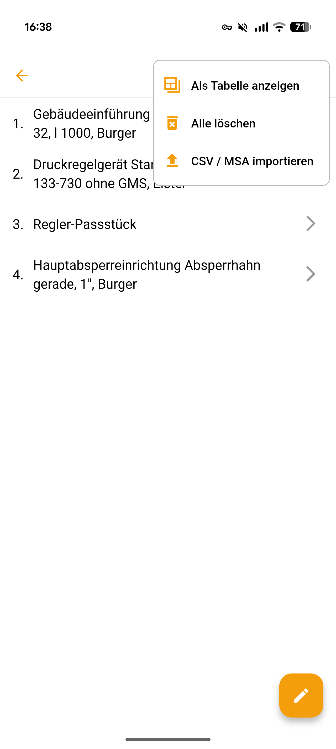 Über diese Option kannst du eine CSV-Tabellen-Datei oder eine MSA-Datei von Georg Fischer importieren, um deine Liste mit Objekten zu bestücken.