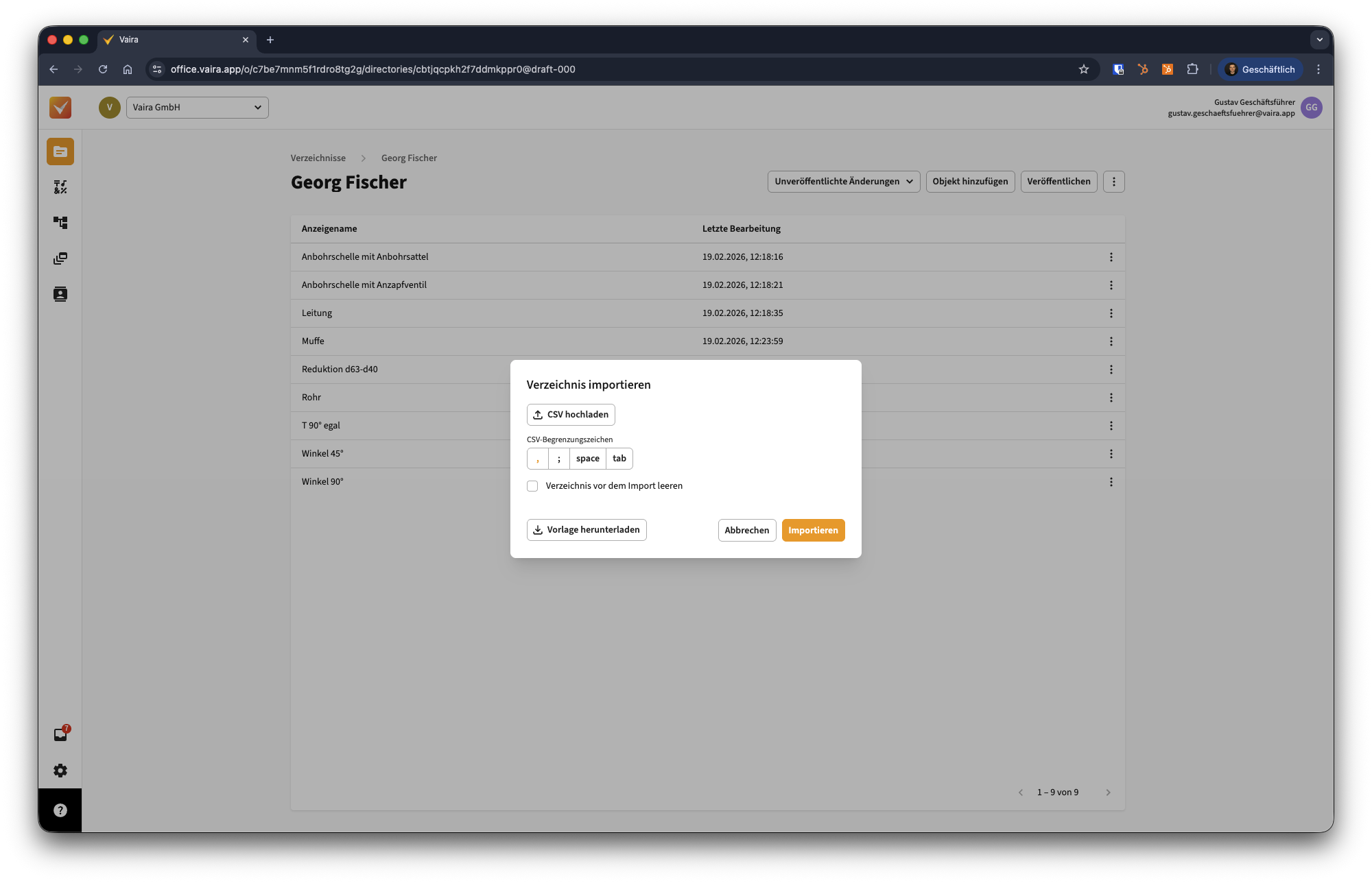 Du hast eine lange Liste an Bauteilen, an Einträgen für dein Leistungsverzeichnis oder Ähnliches und möchtest diese nicht alle manuell im Vaira Office einpflegen? Verständlich. Daher haben wir eine Möglichkeit geschaffen, deine Daten bequem per .csv-Datei in Vaira hochzuladen.