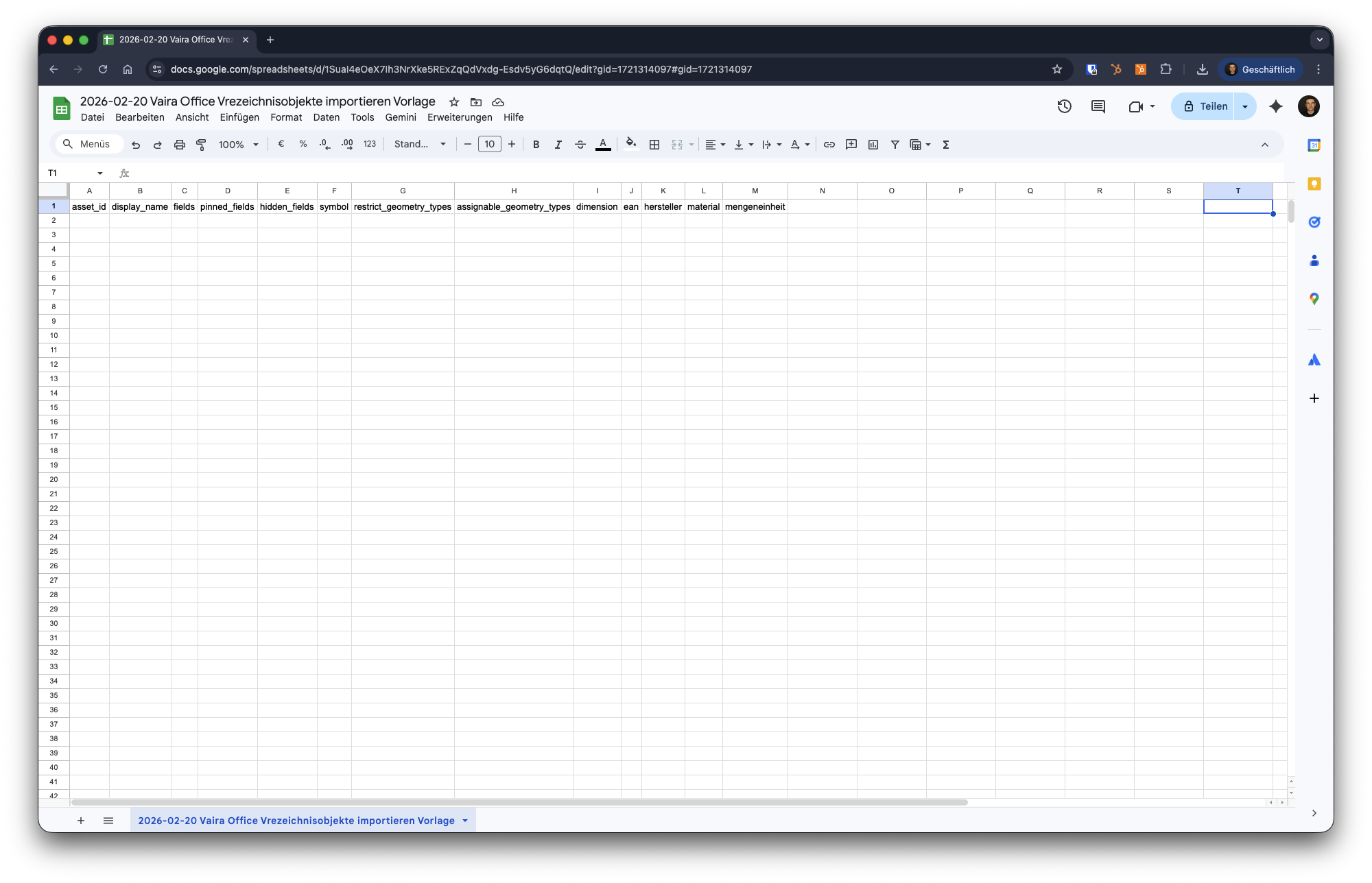Du erhältst mit dem Download eine .CSV-Musterdatei, die du mit jedem gängigen Tabellenprogramm öffnen kannst und die genau der Form entspricht, die du brauchst. Sie beinhält die IDs aller denier Objektfelder und Objekteigenschaften als eigene Spalten. Hier musst du nun nur die Daten aus deinen eigenen Tabellen-Spalten in die passenden Spalten der Muster-CSV kopieren.