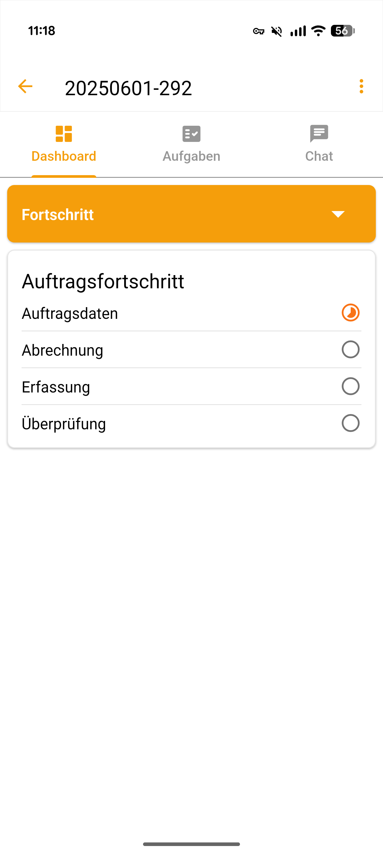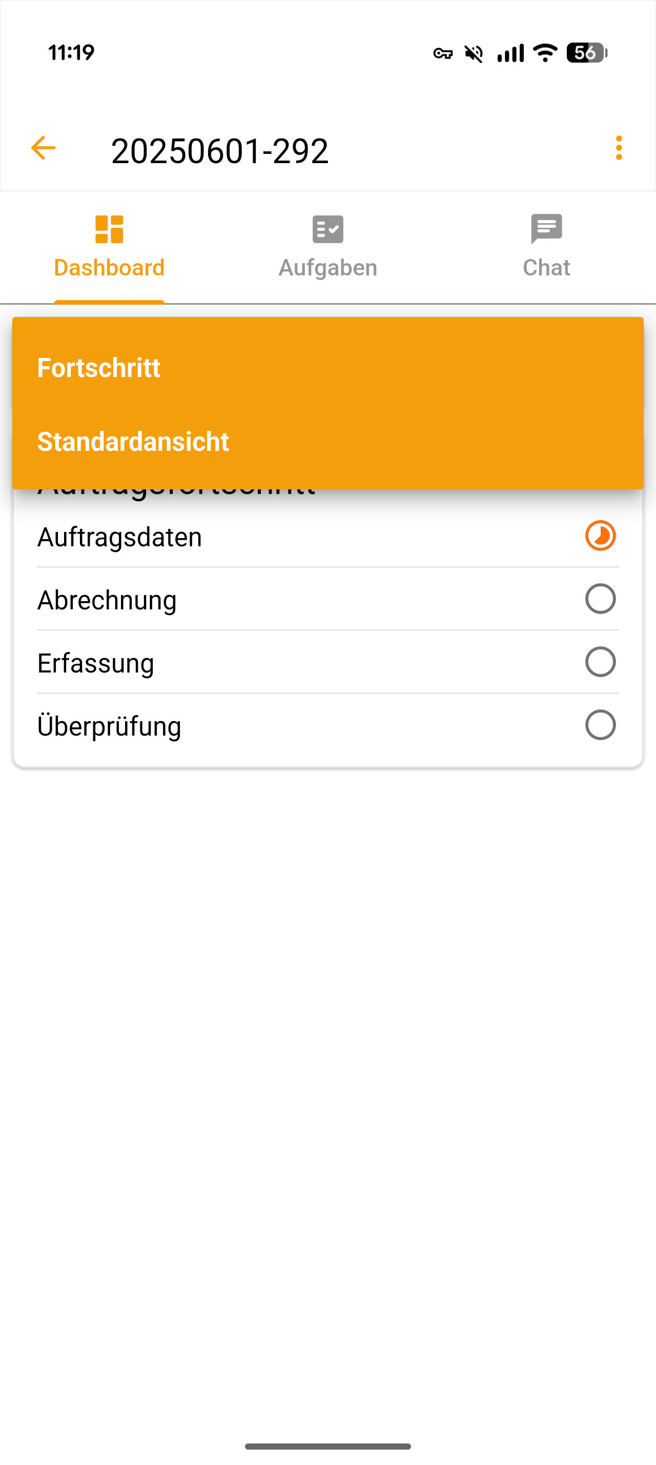 - Unter der Menüleiste solltest du nun einen orangenfarbenes Dropdown-Feld sehen. Im Beispiel unten ist das aktuell das Dashboard "Fortschritt". Darunter siehst du die einzelnen Inhalte des Dashboards. Hier haben wir im Beispiel konfiguriert, dass wir nur den Status-Fortschritt aller Schritte unseres Vorgangs sehen möchten.
