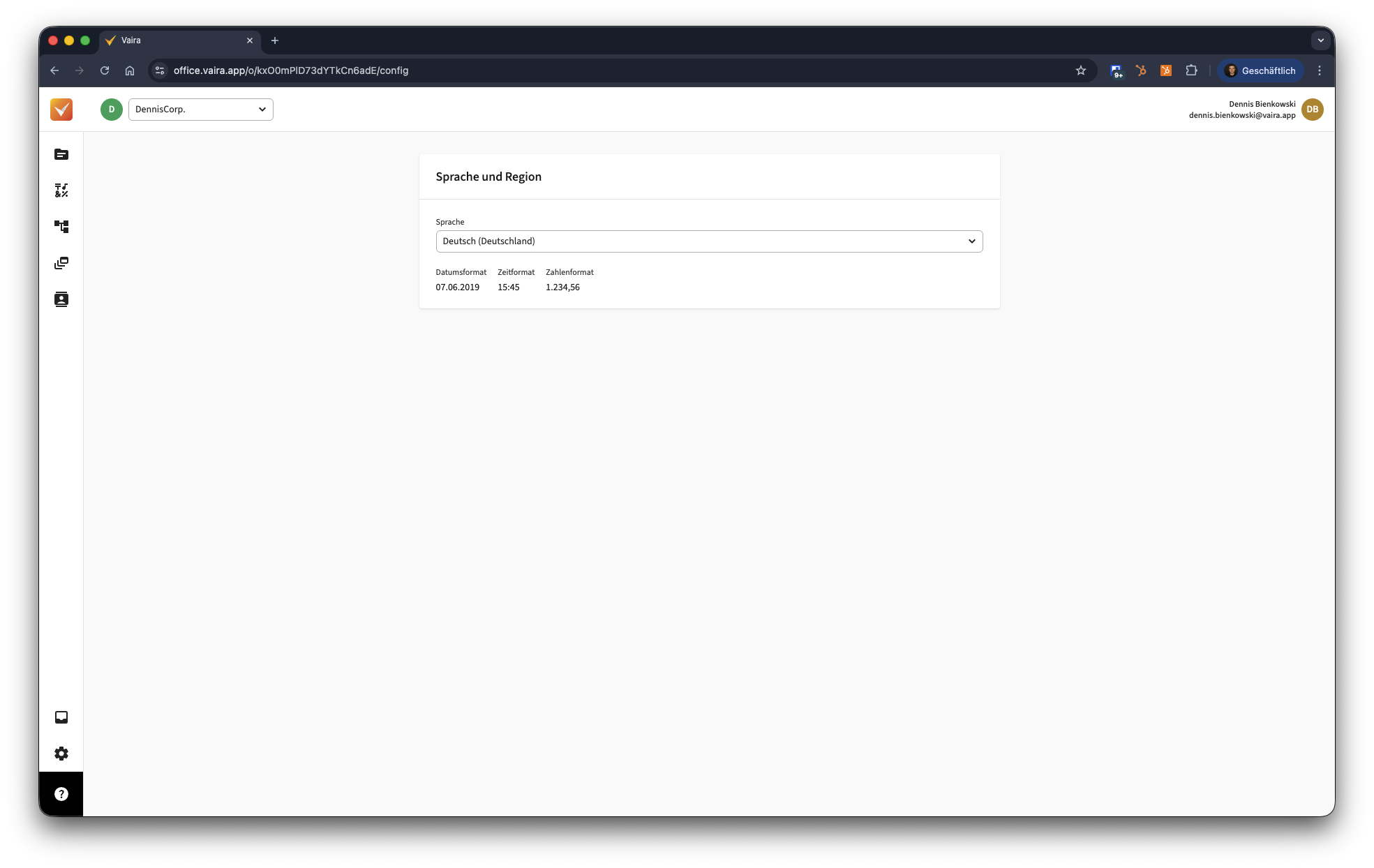 Das war's schon! Bitte beachte, dass von Nutzerinnen und Nutzern eingegebene Texte nicht automatisch übersetzt werden und sich die Sprache nur auf die Systemtexte von Vaira bezieht. Die Namen von Feldern oder von eingegebenen Werten bleiben unverändert.