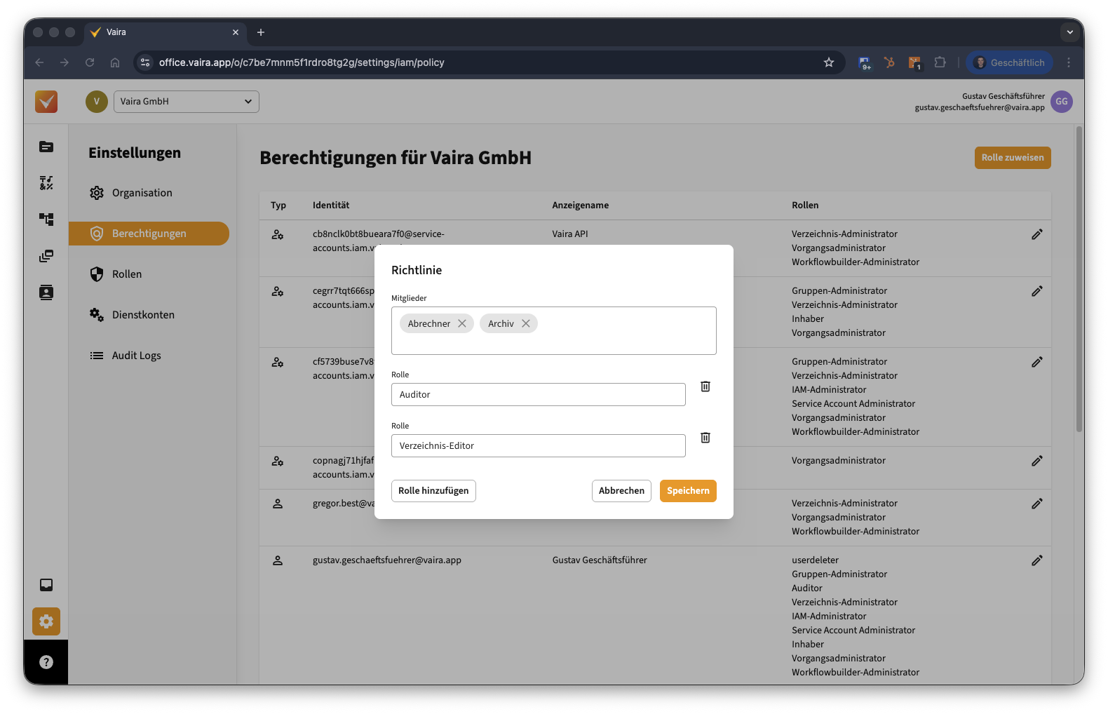 Mit diesen Rollen kannst du bereits alle Funktionen von Vaira sinnvoll für deine Gruppen vergeben, um z.B. Zugriffsrechte auf Verzeichnisse, deine Workflows oder Vorgänge zu steuern. Dir steht es aber natürlich frei, auch eigene Rollen zu entwerfen und beliebige Berechtigungen miteinander zu kombinieren.