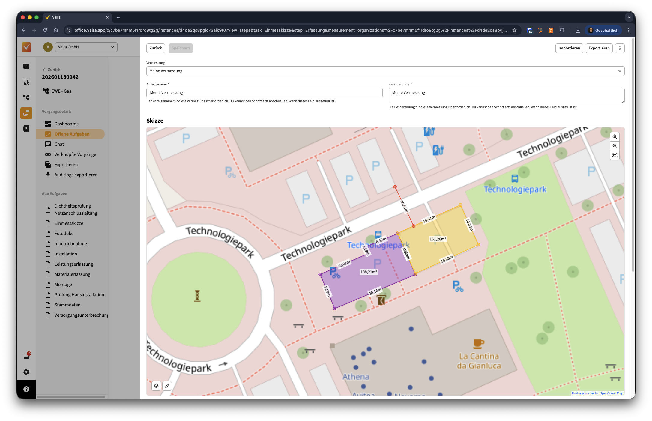 - Wähle die Vermessung aus, die je nachdem, wie sie benannt wurde, unterschiedliche Namen haben kann. Im Beispiel haben wir sie Vermessung genannt. Du findest sie im entsprechenden Feldbereich rechts: