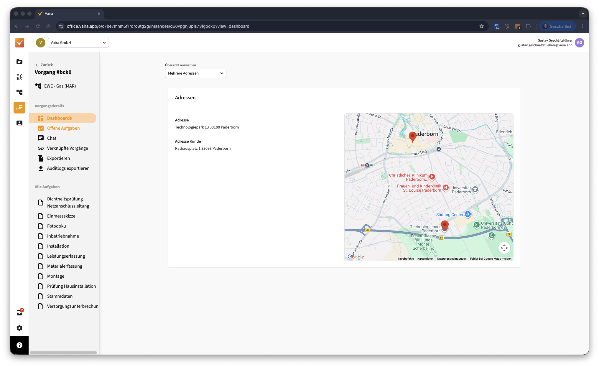 Wenn du ein Feld hier als Adressfeld markierst über diesen Button, wird der Inhalt des Felds als Adresse interpretiert und an das Kartenmodul übergeben. Bei einem Karten-Widget musst du mindestens ein Adressfeld definieren. Du kannst auch mehrere Felder als Adressfelder definieren. Deine Kartenansicht zoomt dann so weit heraus, dass alle Adressfelder auf ihr dargestellt werden können. Das sieht dann z.B. nur mit zwei Adressfeldern und ohne weitere Felder so aus: