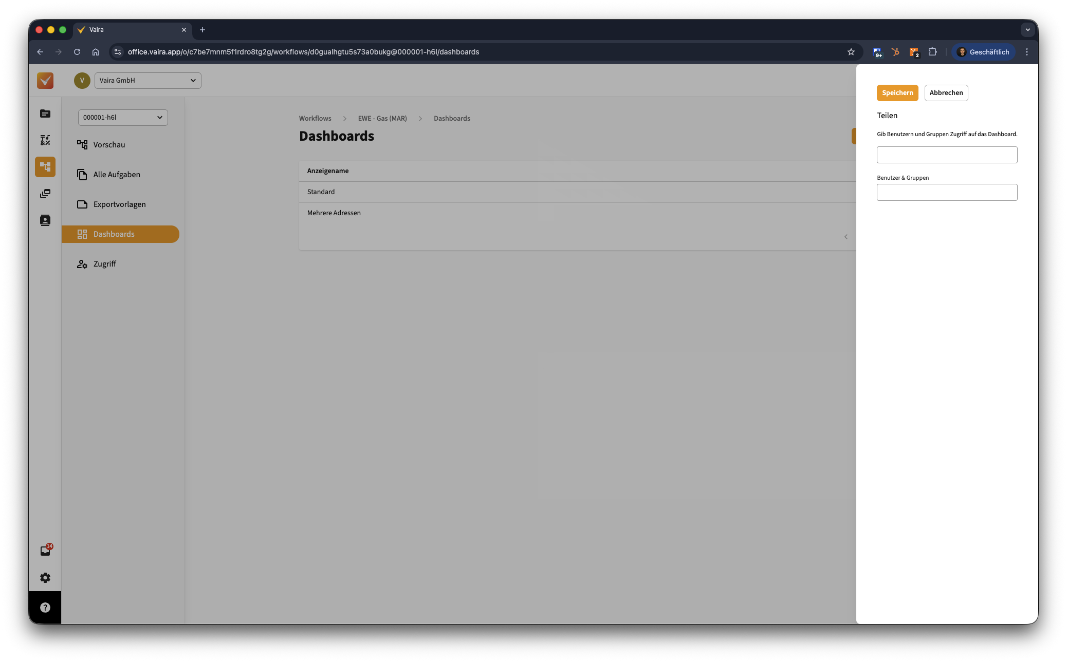Gehe nun wieder in deine Liste der erstellen Dashboards für deinen Prozess. Hier wird dein neu erstelltes Dashboard nun Teil der Liste sein. Um das Dashboard selbst nutzen zu können oder es anderen zur Verfügung zu stellen, musst du es nun noch Teilen.