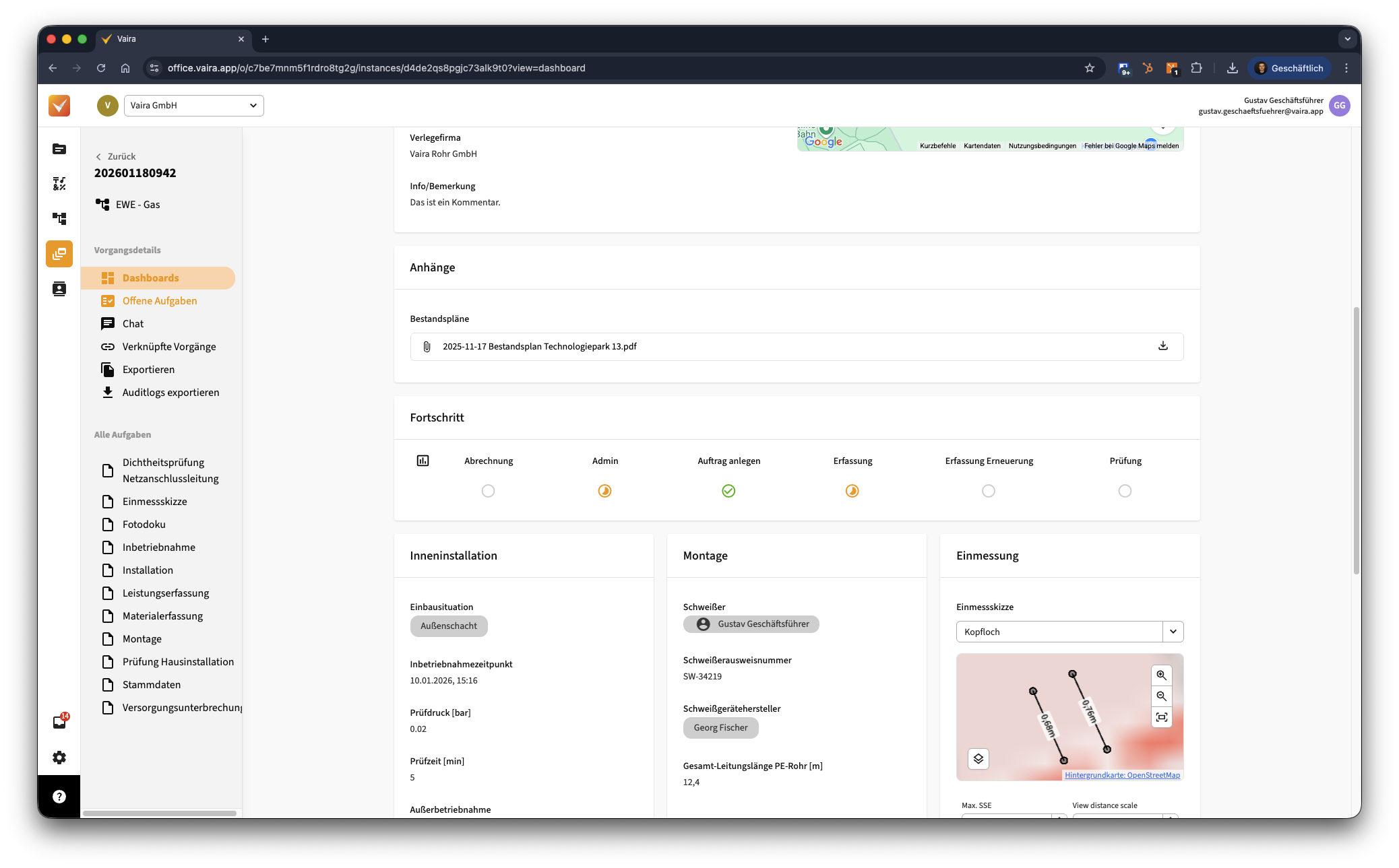 Du hast nun ein eigenes Dashboard entworfen, es mit dir (und vielleicht auch anderen geteilt). Zeit, dass du dir dein Dashboard nun anguckst! Klicke dazu in deine Vorgangsliste und öffne eine Vorgang, der aus dem entsprechenden Workflow erstellt wurde. Links in der Navigation kannst du jetzt auf Dashboards klicken.