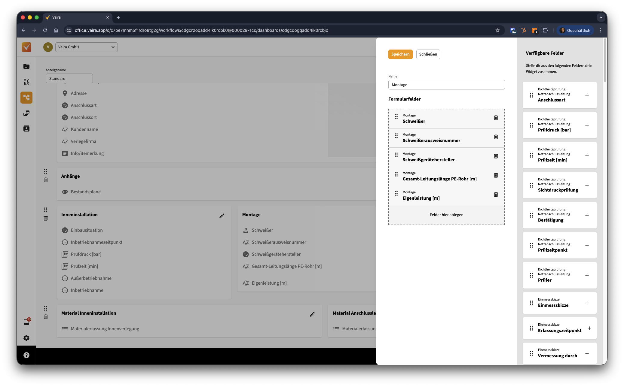 Oben im linken Bereich kannst du der Kachel einen eigenen Anzeigenamen geben. Im Bereich rechts siehst du alle verfügbaren Felder aus deinem Workflow. Mit einem Klick auf das Plus neben einem Feld oder durch klicken und ziehen in den grauen Bereich nach links mit dem Text Felder hier ablegen stattest du deine Kachel mit den Feldern aus.