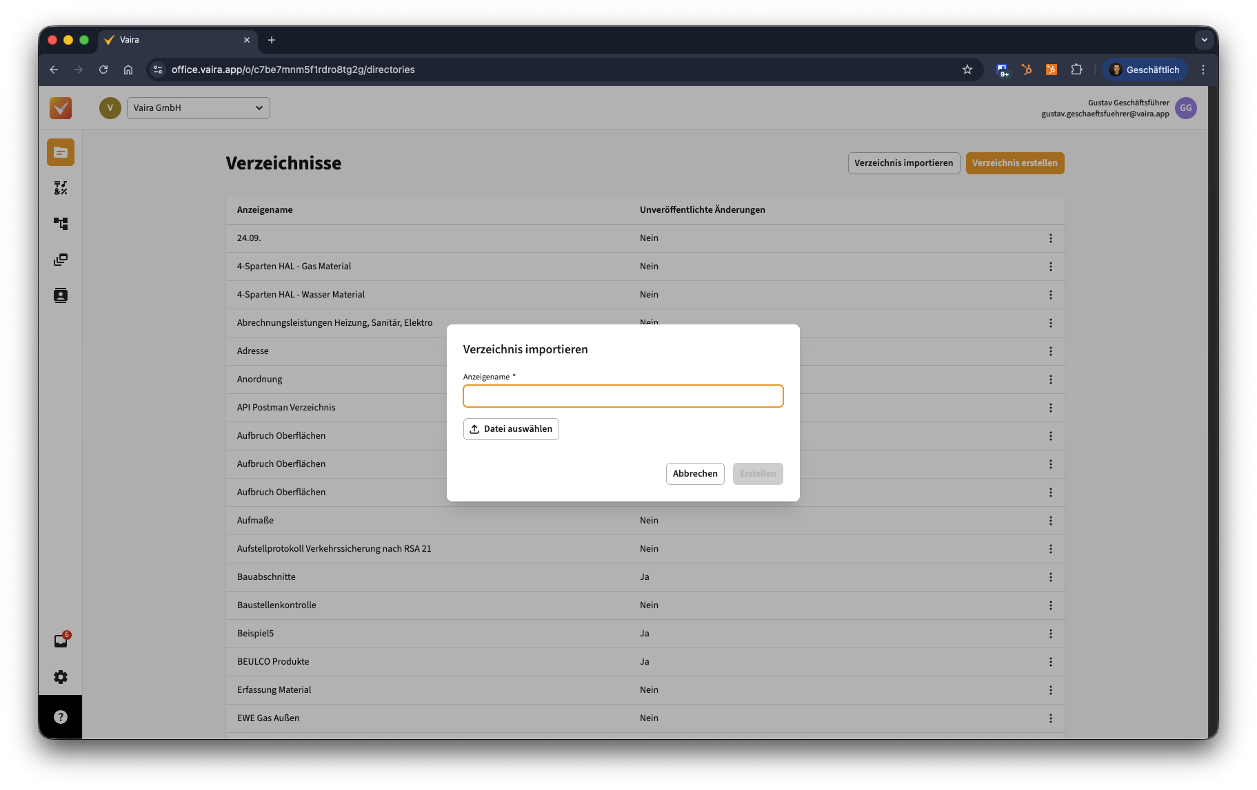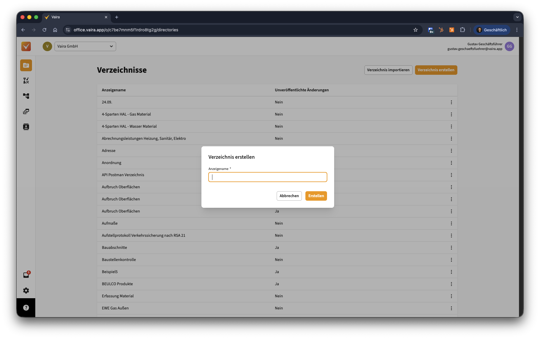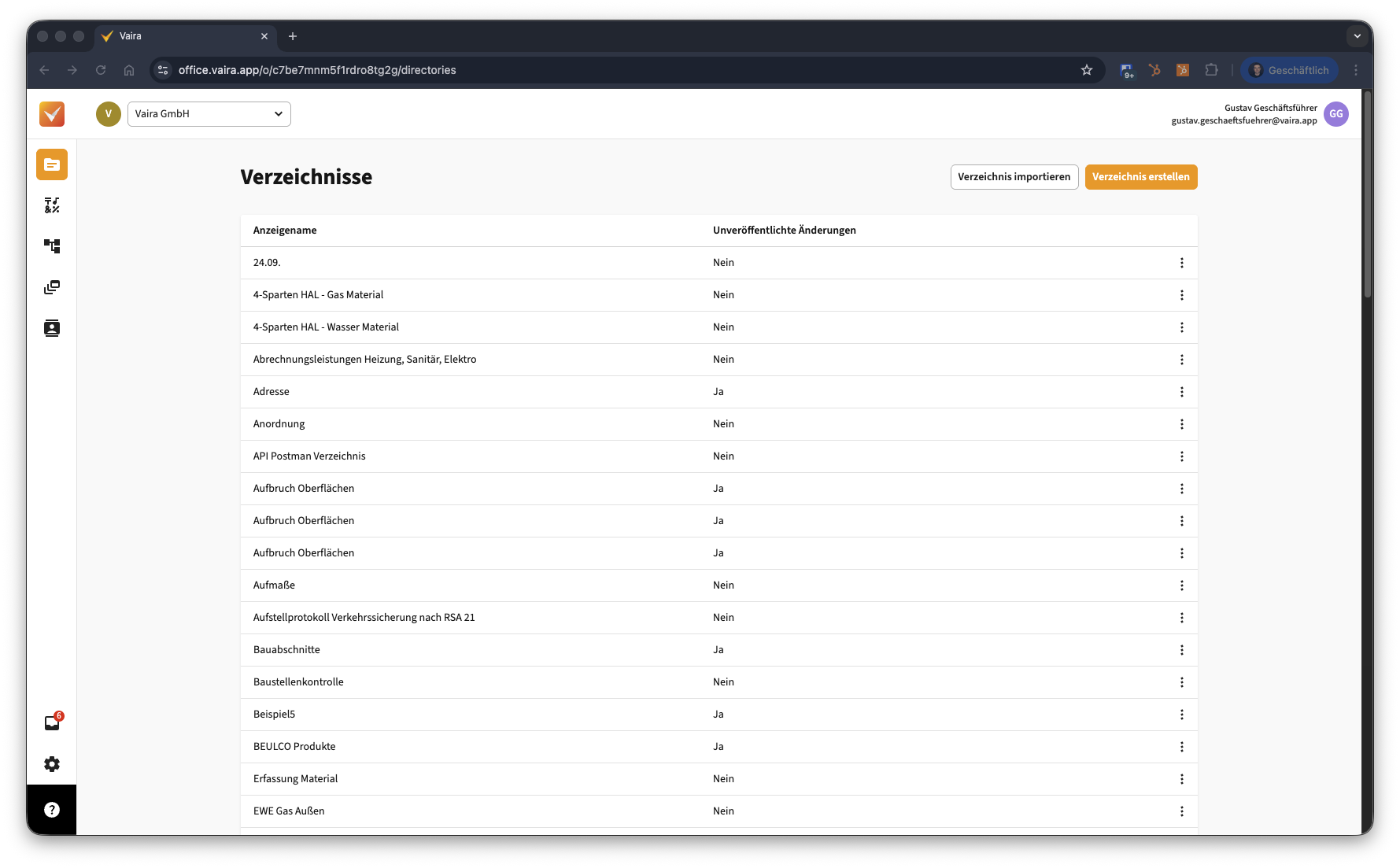 - Klicke im Vaira Office links in der Seitennavigation auf den obersten Menüpunkt, der dich zur Verzeichnisliste führt.