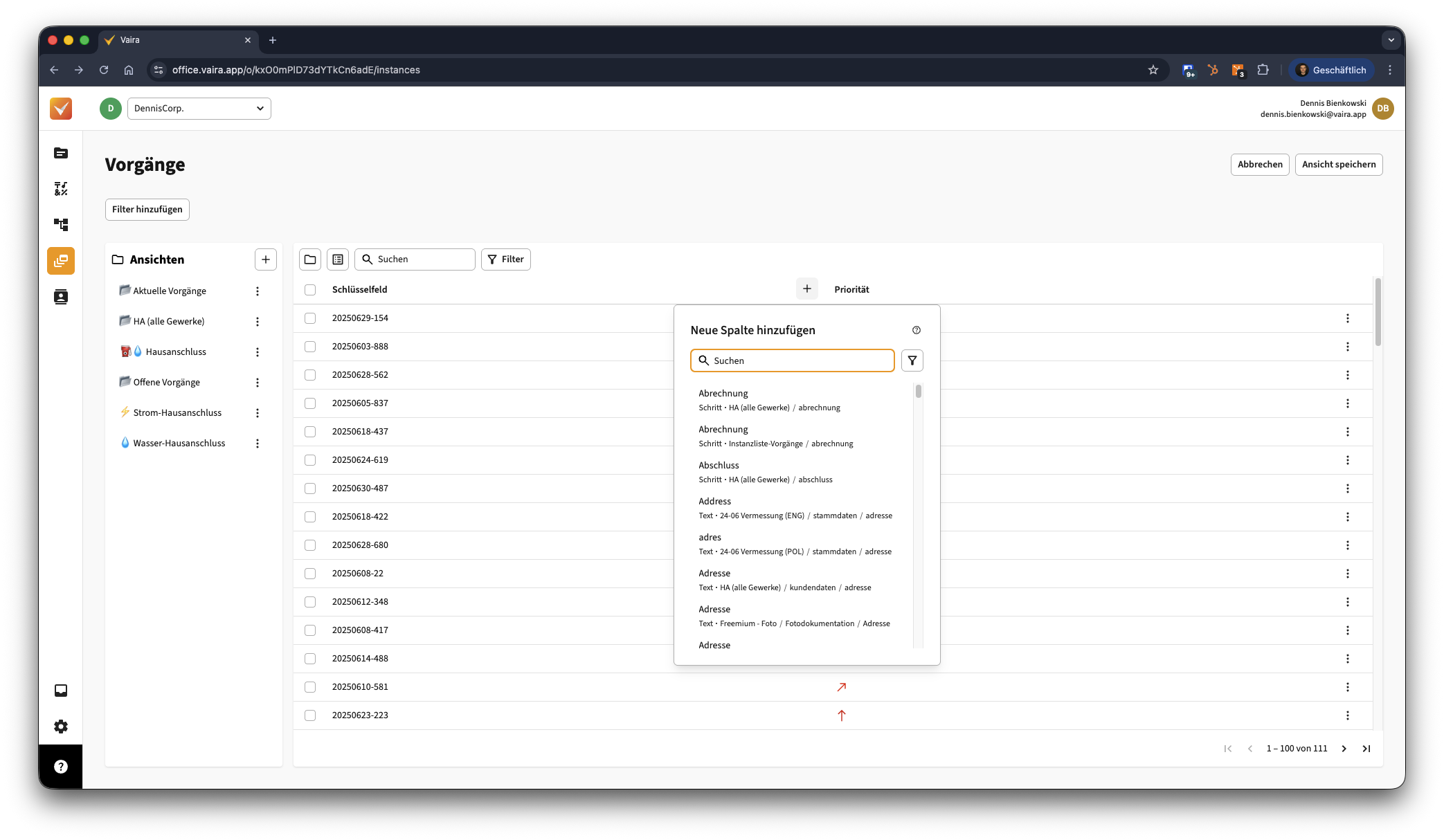 - Daneben findest du die Schlüsselfeld-Spalte. Was ein Schlüsselfeld ist, erfährst du hier – kurz gesagt ist es der „Rufname” deines Vorgangs, den du auch deinen Kollegen durchgeben würdest, damit ihr wisst, über welchen Vorgang ihr sprecht.