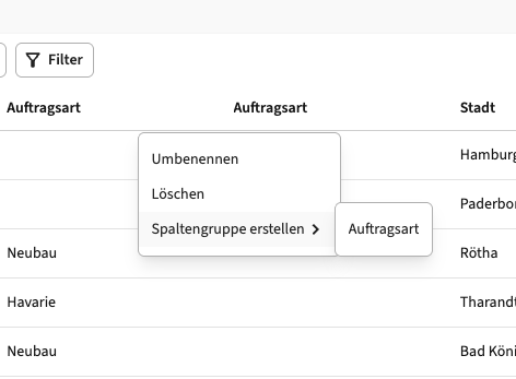- Anschließend öffnet sich ein kleines Popup. Hier kannst du den Anzeigenamen für die Spaltengruppe einstellen. Das kann im Fall von zwei Mal "Auftragsart" naheliegend dann auch die Gruppe "Auftragsart" werden.