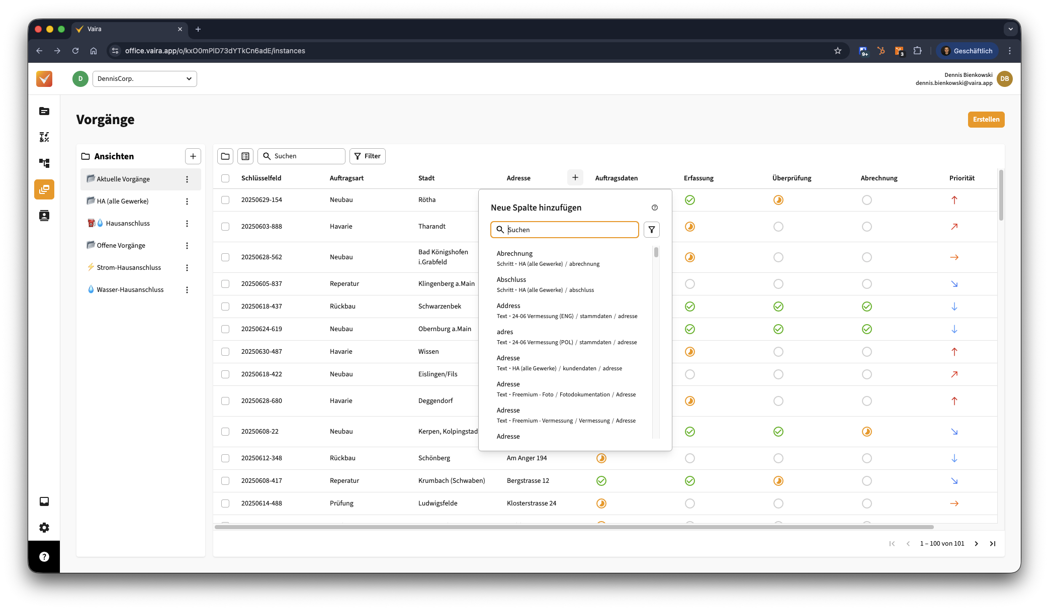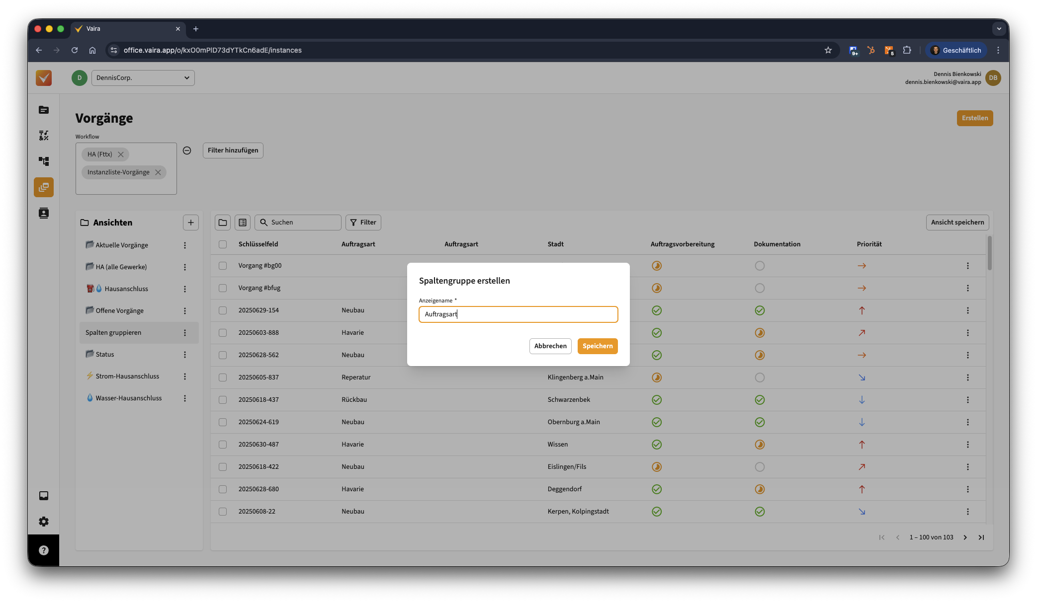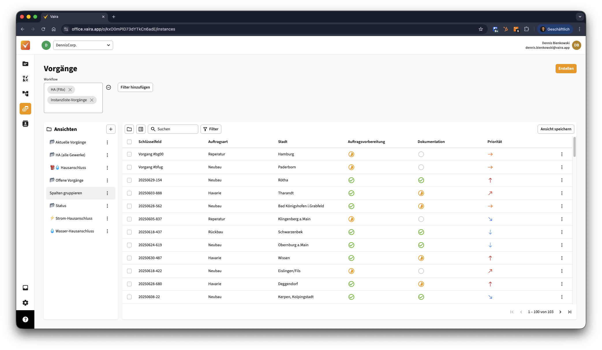 - Du siehst hier bereits: Auftragsart und Stadt sind bei beiden Workflows bzw. Instanzen eigentlich das gleiche Feld, aber sie beziehen sich auf unterschiedliche Workflows. Daher haben die oberen beiden Vorgänge, die aus dem Workflow "HA (Fttx)" kommen, andere Spalten befüllt, als alle Vorgänge unter ihnen, die aus dem Workflow "Instanzliste-Vorgänge" stammen.