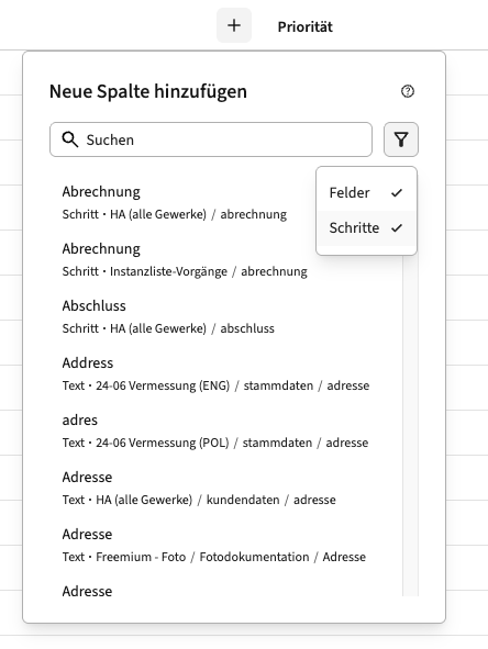 - Du kannst die Liste auf Schritte oder Felder hin filtern. Klicke dazu auf das Filter-Symbol rechts und wähle aus, welcher Typ dir in der Liste angezeigt werden soll.
