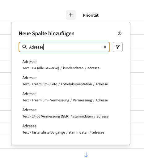 Eine besondere Option bietet sich dir in der Auswahl, wenn du mehrere Spalten in deiner Vorgangsliste hinzugefügt hast. Da sich in deiner Vorgangsliste auch Vorgänge aus unterschiedlichen Workflows sammeln können, kann es unübersichtlich werden, wenn du z.B. jedes "Adresse"-Feld jedes Workflows als eigene Spalte hinzufügen müsstest. Dafür gibt es Spaltengruppen.