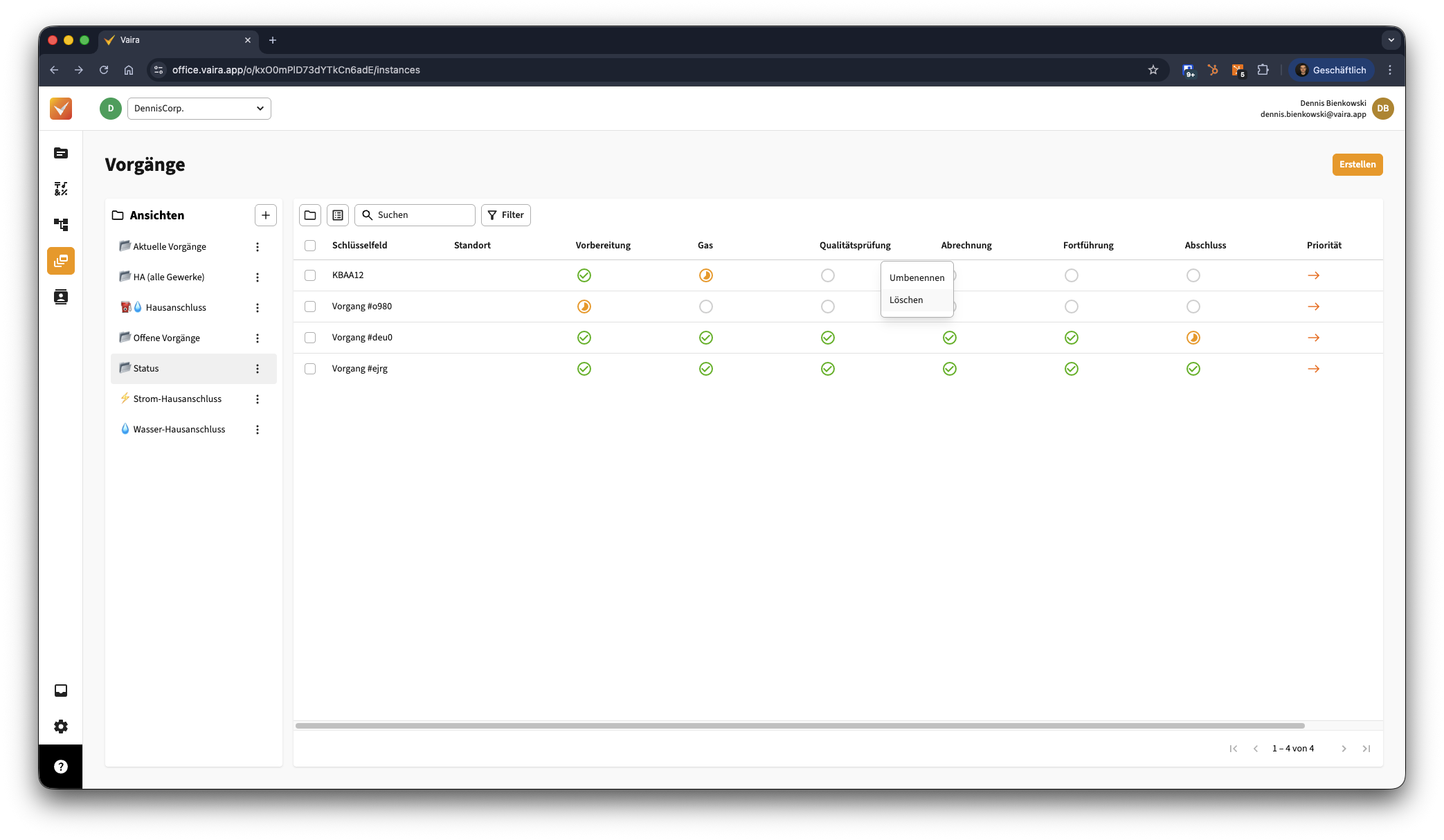 - Oben links siehst du über die Filter-Einstellungen, dass wir in dieser Ansicht nur Vorgänge aus den Workflows "HA (Fttx)" und "Instanzliste-Vorgänge" in unserer Vorgangsliste angezeigt bekommen möchten.
