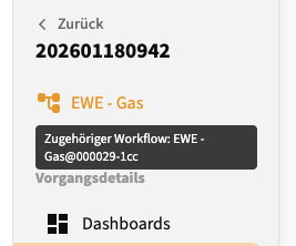 Alternativ kannst du auch mit dem Mauszeiger über die den Namen des Workflows fahren. In der Info-Box siehst du dann den Revisionsnamen – in diesem Beispiel wäre es die Revision "@00029-1cc" des Workflows "EWE - Gas".