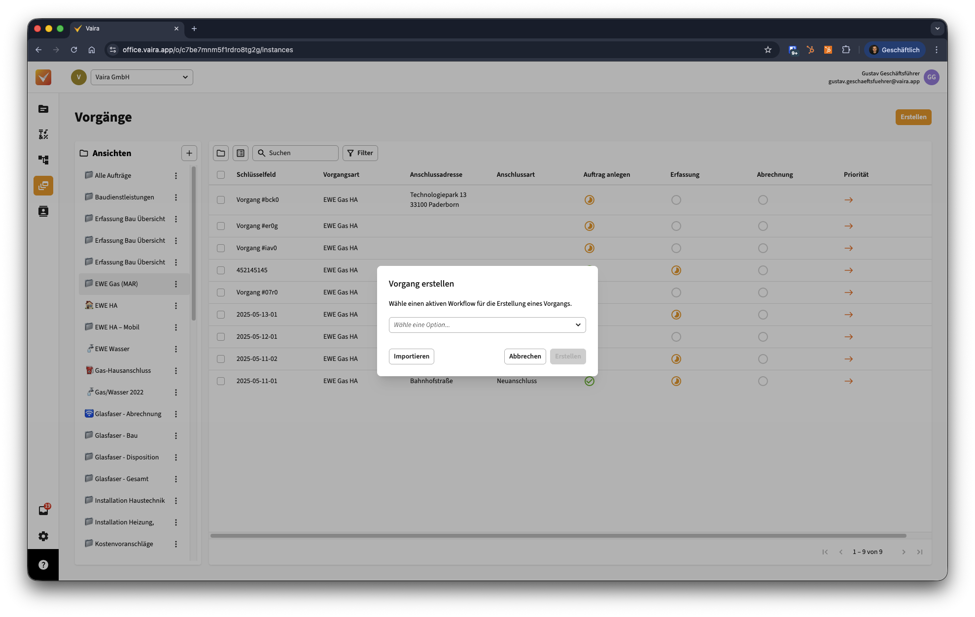 Bevor du startest: In dieser Anleitung gehen wir davon aus, dass du bereits einen Workflow erstellt hast (Wie kann ich einen leeren Workflow erstellen?) und dass du dich mit dem groben Aufbau des Vaira Office (Wie ist das Vaira Office aufgebaut?) und deiner Vorgangsliste (Wie ist die Vorgangsliste im Vaira Office aufgebaut?)