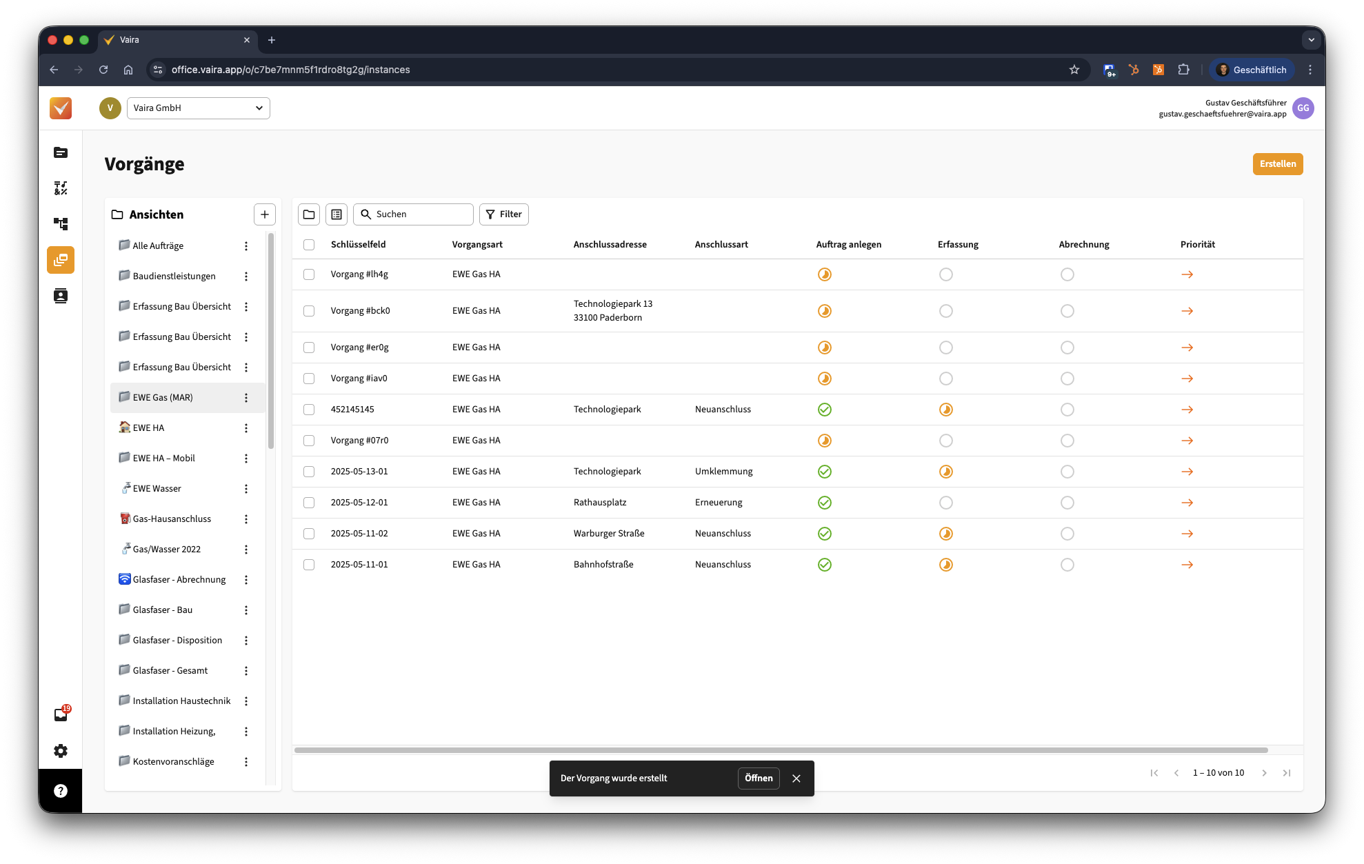 Dein neuer Vorgang ist nun erstellt und erscheint – sofern deine Liste nicht anders sortiert ist – ganz oben in deiner Vorgangsliste. Unten erscheint außerdem eine Hinweisbox, über die du direkt mit einem Klick auf Öffnen in den Vorgang springen kannst.