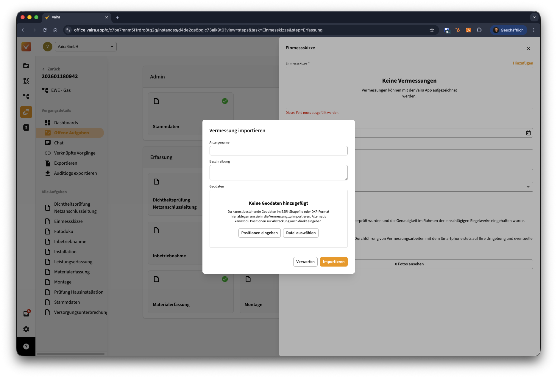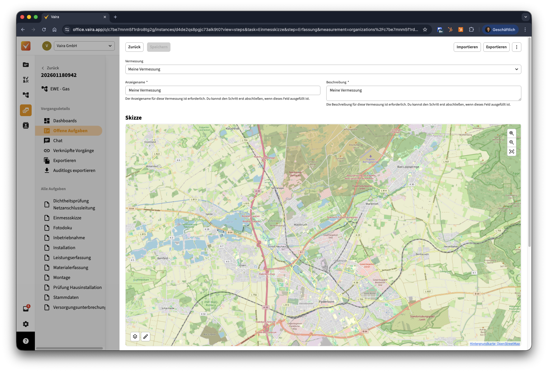- Gehe im Vaira Office in deine Vorgangsliste und wähle einen Vorgang mit einem Vermessungsfeld aus.