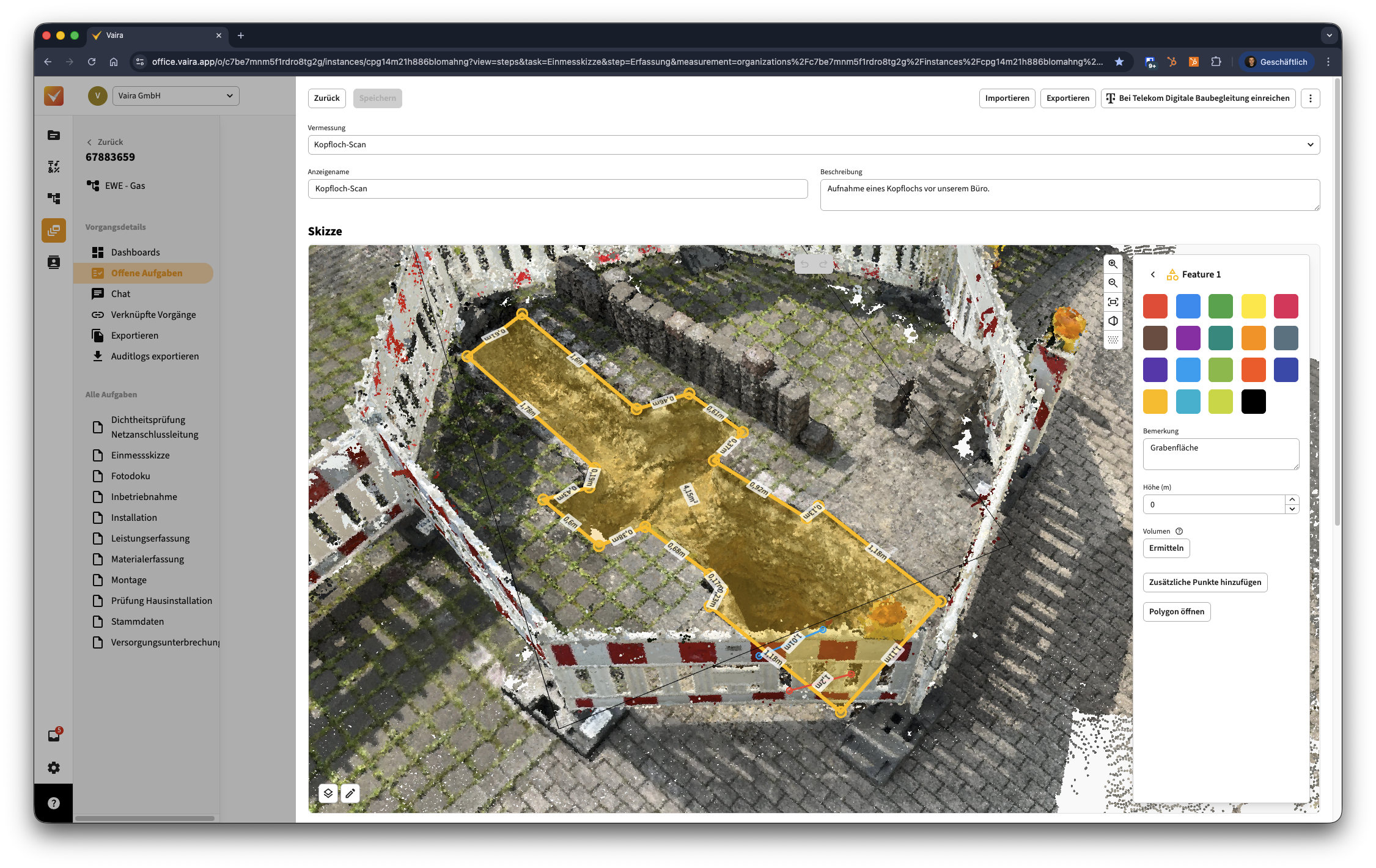 Die Funktion der 3D-Modell-Erfassung mit der Vaira App bringt viele spannende Vorteile mit sich. Einer davon ist es, dass du auch nachträglich im Büro noch Vermessungen am offenen Graben vornehmen kannst – selbst, wenn dieser in der Realität schon lange wieder geschlossen ist. Du kannst beliebig viele georeferenzierte Messpunkte innerhalb des Modells erzeugen und auch nachträglich noch bearbeiten. Wie du das machst erfährst du in dieser Anleitung.