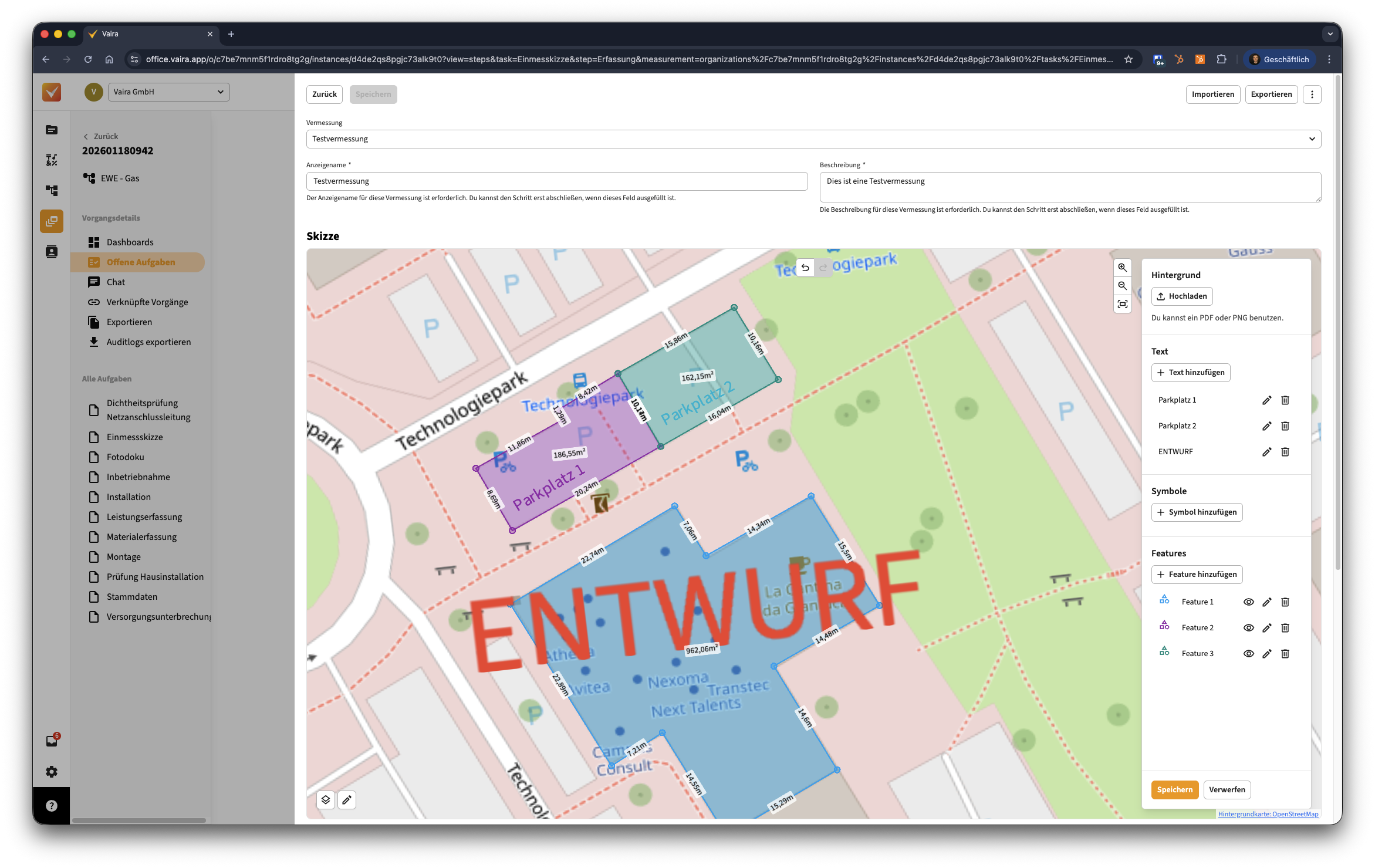 - Öffne im Vaira Office einen deiner Vorgänge, in dem du bereits eine Vermessung vorgenommen hast.