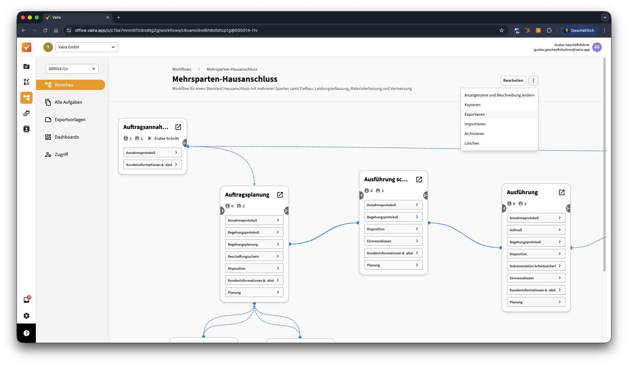 - Um einen Workflow zu exportieren, logge dich zunächst im Vaira Office ein und öffne deine Workflow-Übersicht.