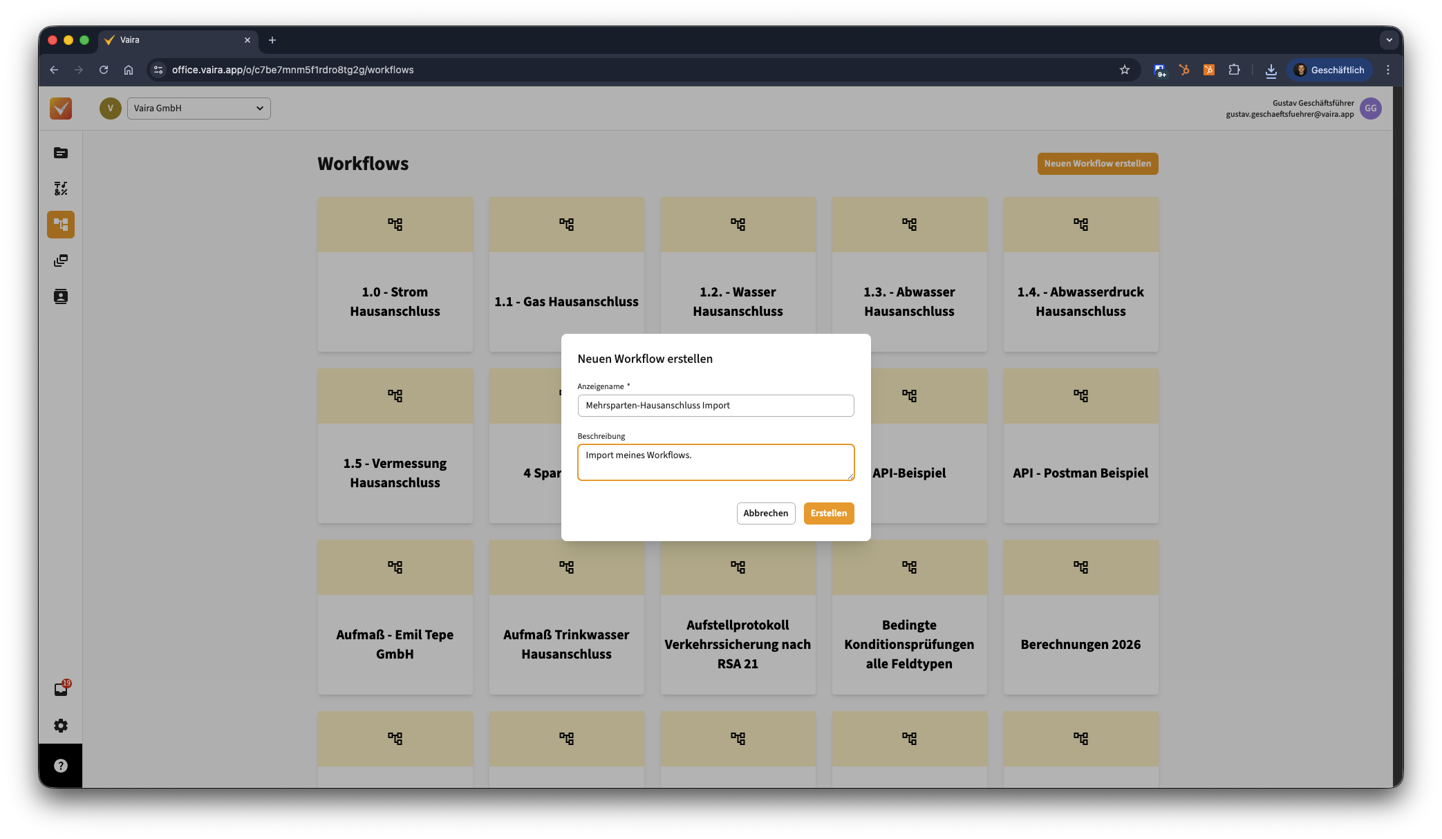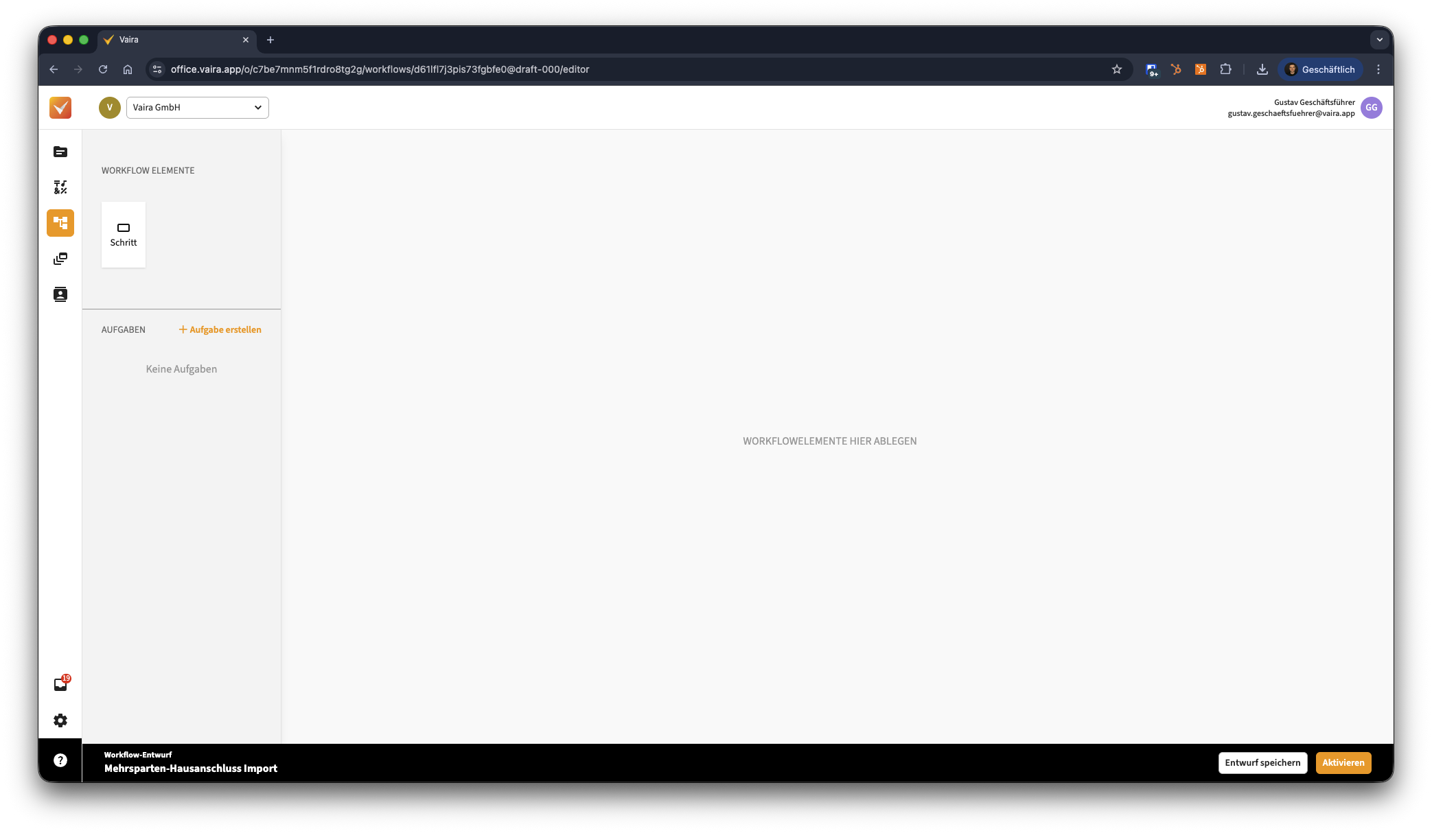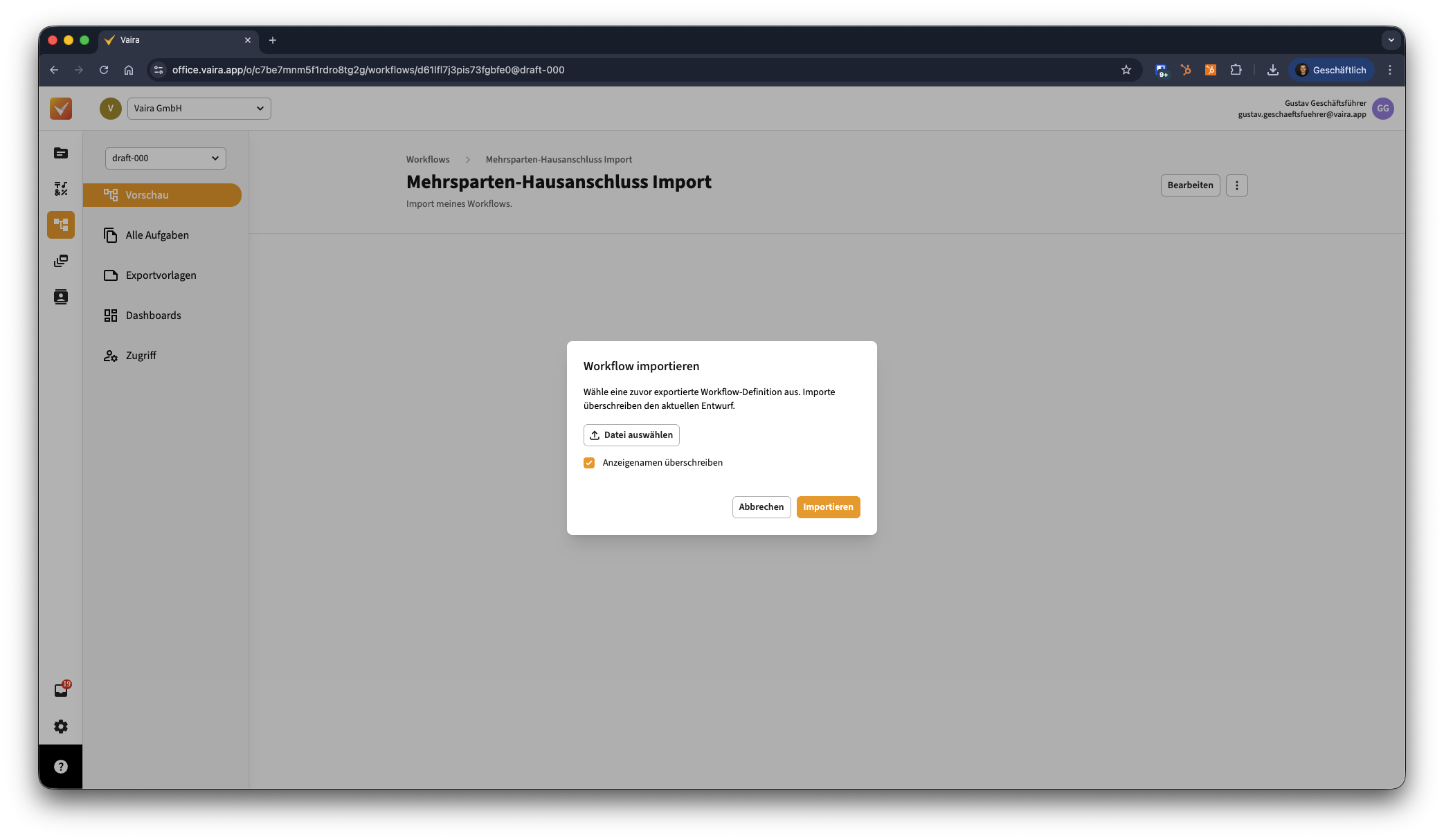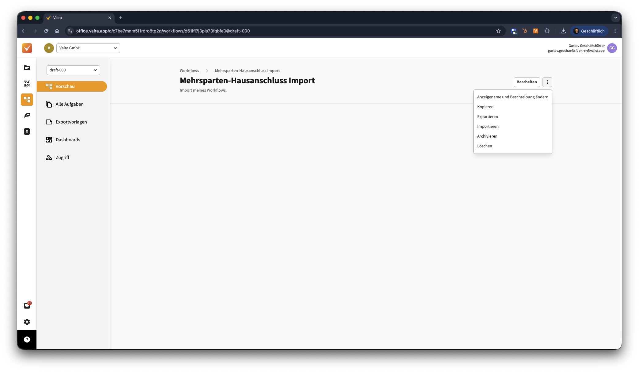 - Um einen Workflow zu importieren, logge dich zunächst im Vaira Office ein und öffne deine Workflow-Übersicht.