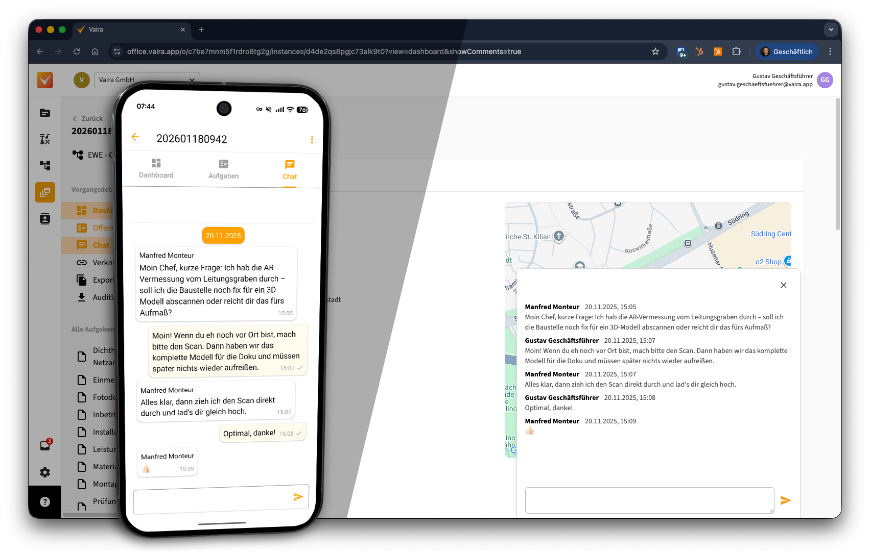 Über Vaira können alle Akteure, egal ob im Büro über das Vaira Office oder draußen im Einsatz mit der Vaira App, miteinander chatten. Das geht nicht nur schnell, sondern Beteiligte können flexibler als bei einem Anruf reagieren und die Unterhaltung ist automatisch und dauerhaft dokumentiert. So lassen sich alle Informationen in einem Auftrag ohne Mehraufwand zusammenhalten.