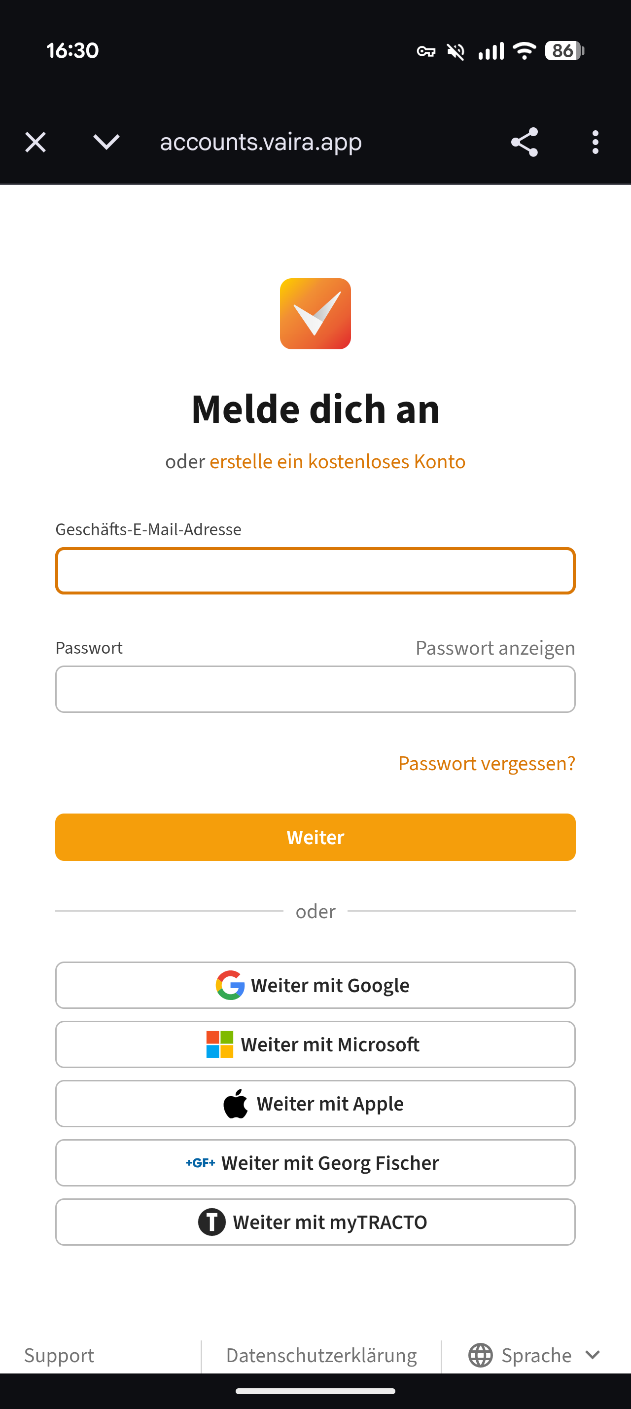 Wichtig: Single-Sign-On nutzt nicht die Vaira-Login-Daten. Stattdessen verwendest du hier die Login-Daten des jeweiligen Anbieters (z.B. Google, Microsoft, Apple, Georg Fischer oder myTRACTO).