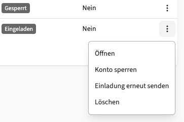 Über die Optionspunkte rechts in jeder Nutzerzeile kannst du ein Untermenü öffnen. Hier kannst du das entsprechende Nutzerprofil Öffnen, das Konto sperren oder Löschen. Sollte eine Einladung ausstehen, kannst du hier außerdem die Einladung erneut senden.