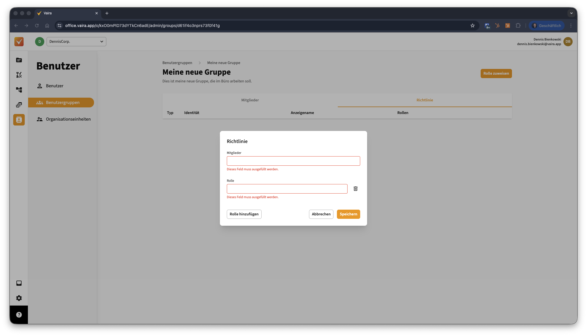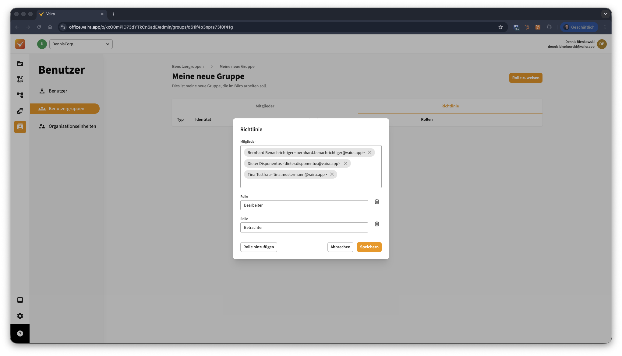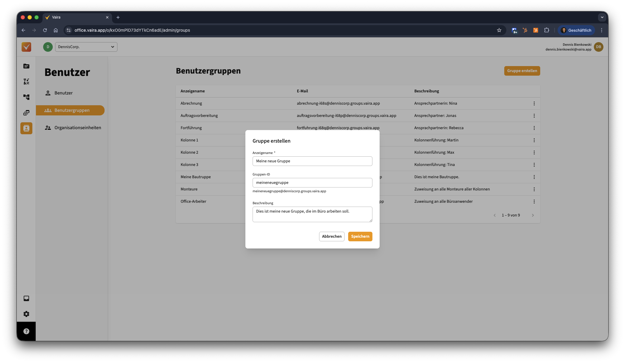- Um eine neue Nutzergruppe zu erstellen, klicke links im Vaira Office auf den Menüpunkt Benutzer und Gruppen.