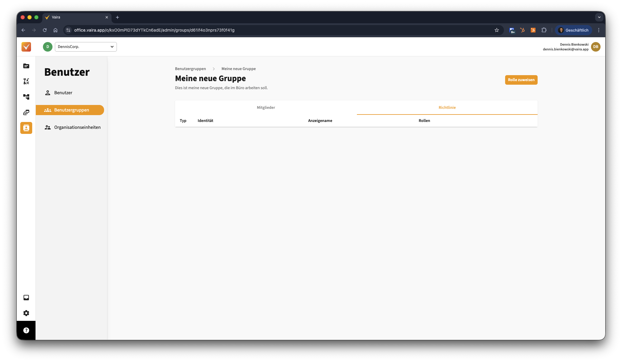 - Klicke oben rechts auf den Button Rolle zuweisen, um eine neue Richtlinie zu erstellen.