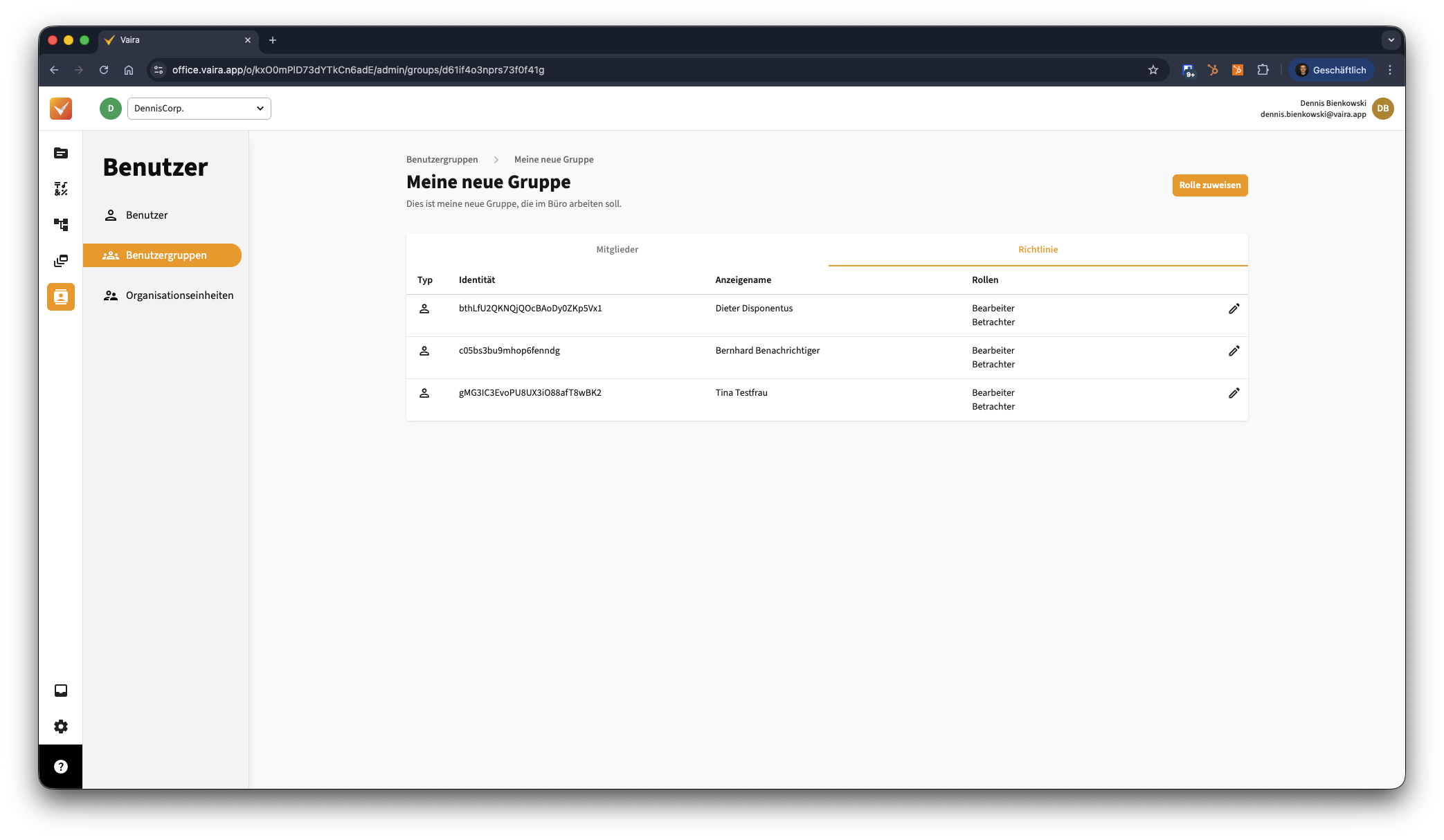 - Um einer Gruppe Berechtigungen zuzuweisen, klicke links im Vaira Office auf den Menüpunkt Benutzer und Gruppen.