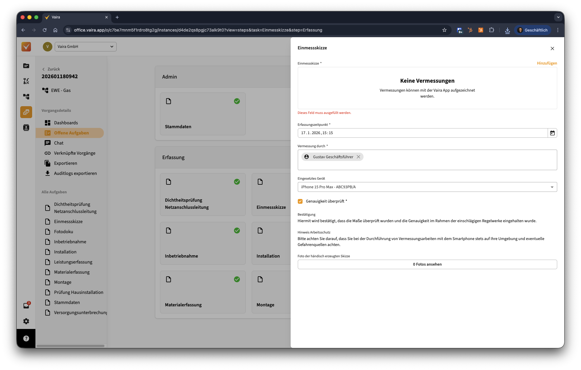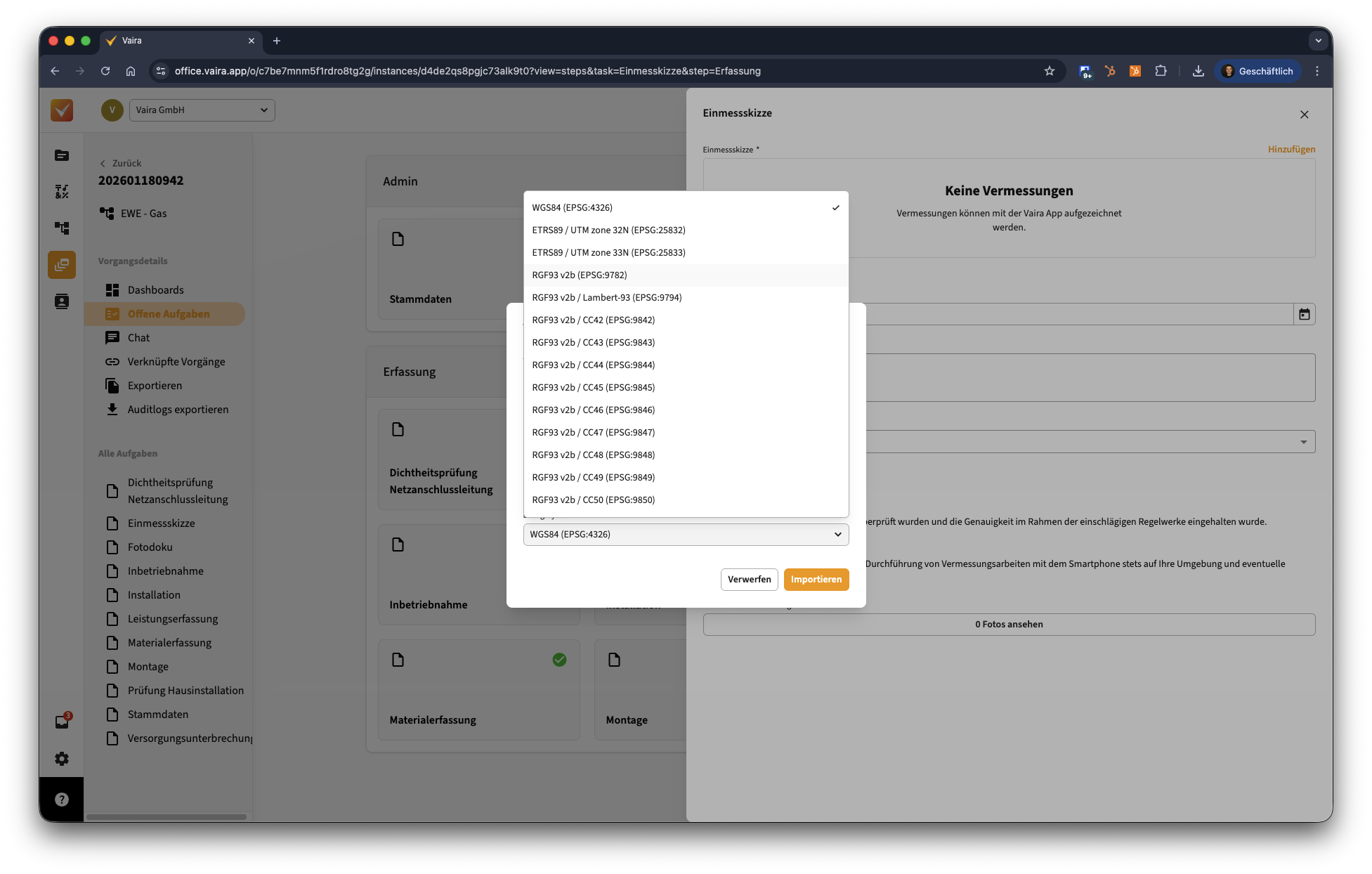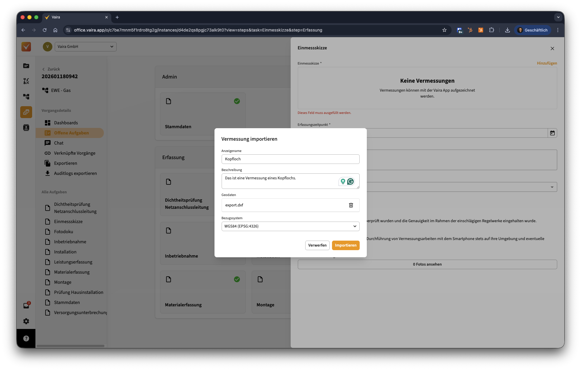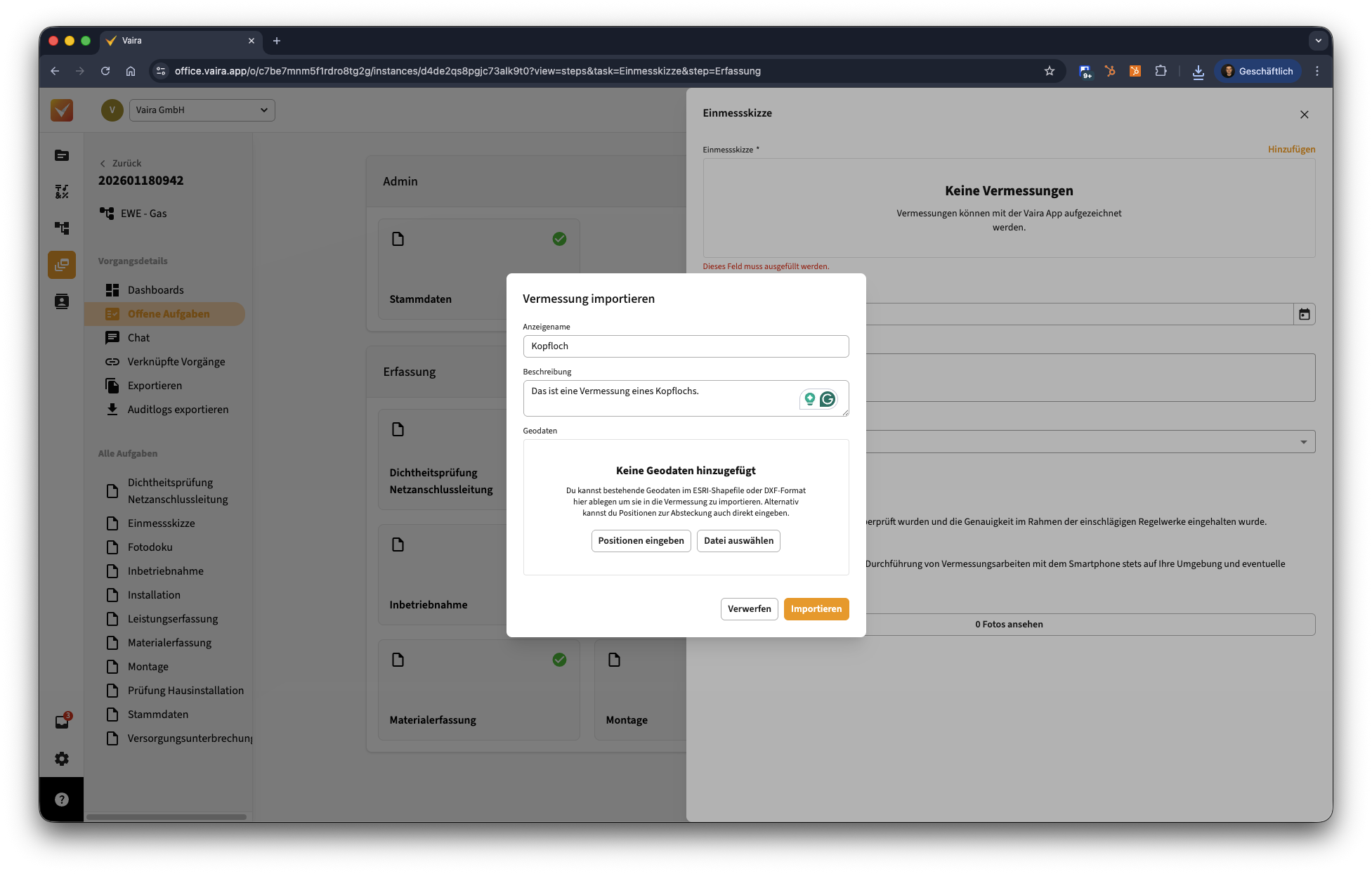 1. Öffne einen Vorgang in deinem Vaira Office, in dem du die Vermessung hochladen möchtest.