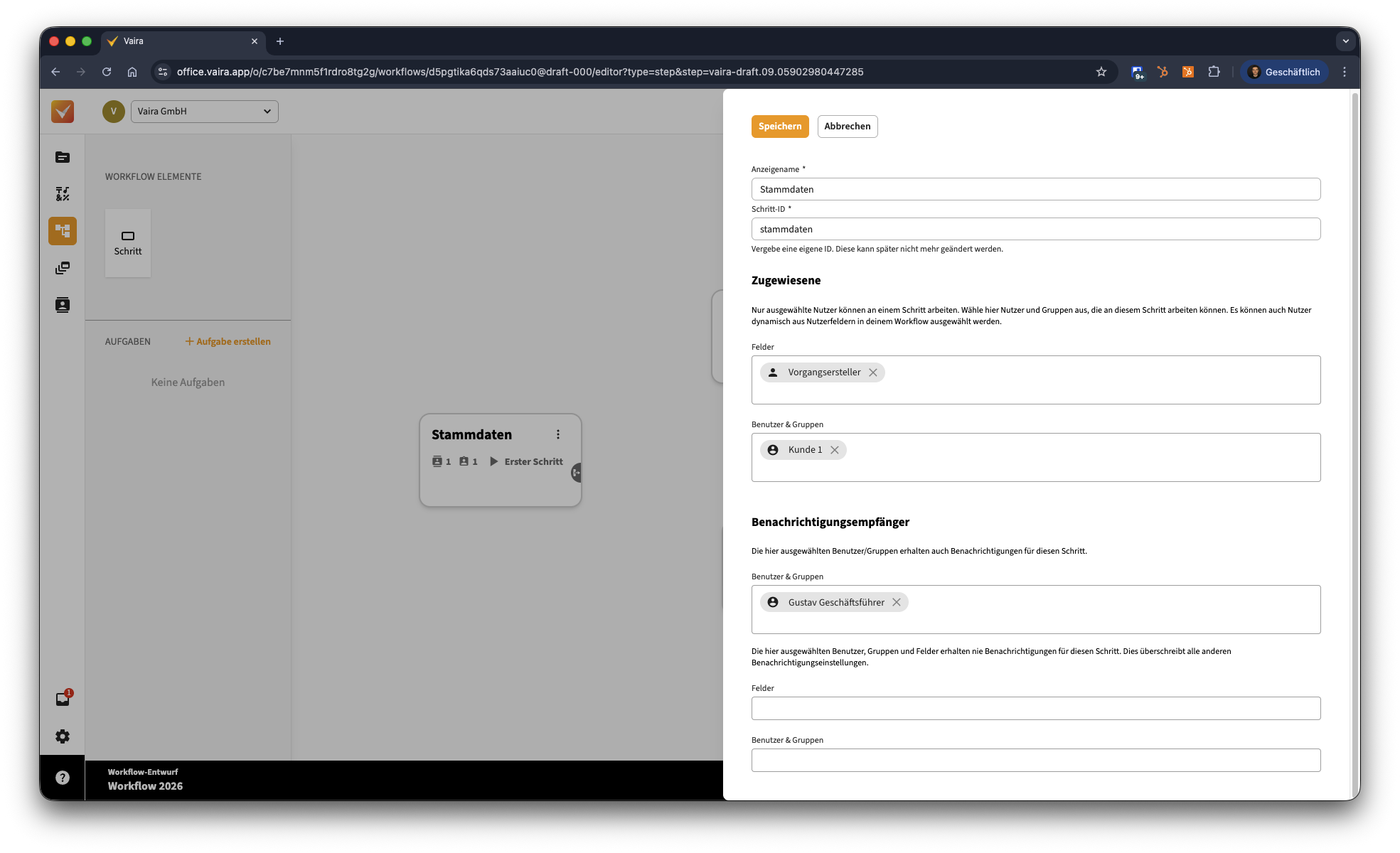 Erfahre, wie du Schritte in Workflows im Vaira Office mit Namen, IDs und Feldern ausstatten kannst.