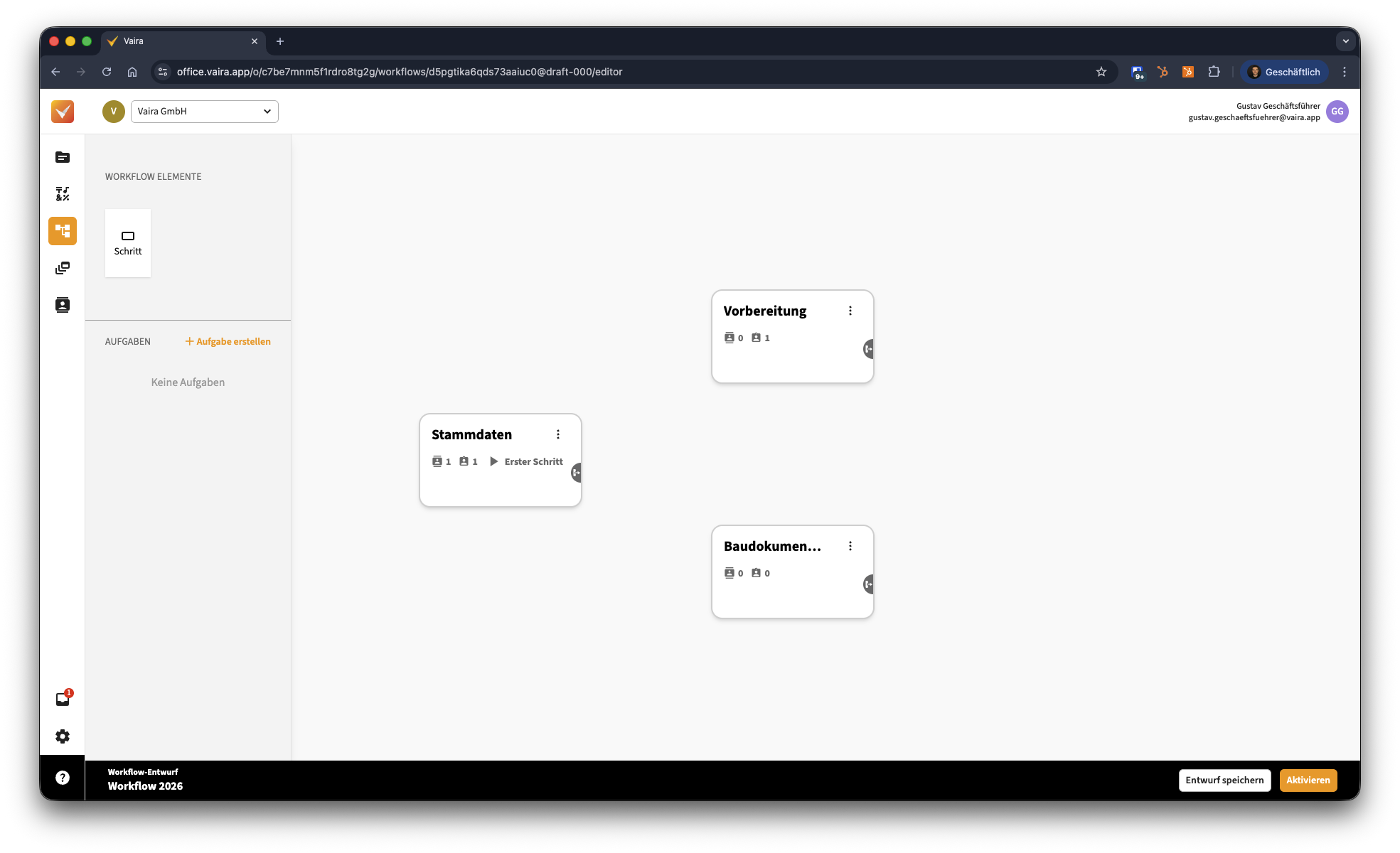 Navigiere im Vaira Office zunächst zu deinen Workflows und erstelle hier einen neuen Workflow oder bearbeite einen bestehenden Workflow.