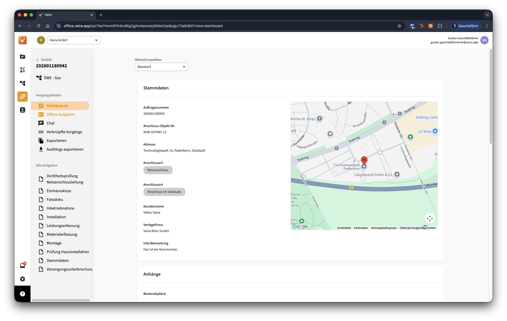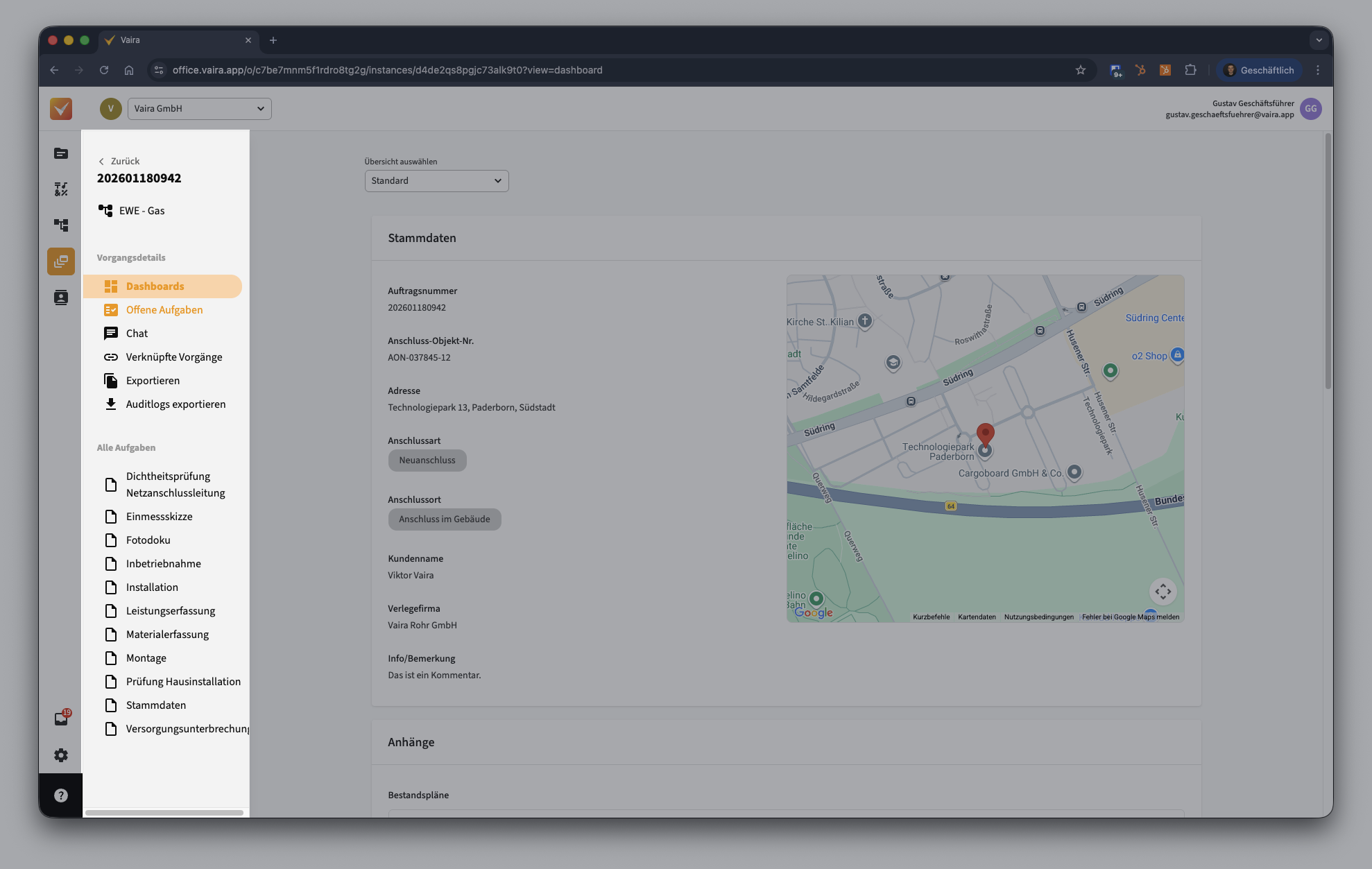 Wenn du einen Vorgang aus deiner Vorgangsliste öffnest, kommst du zu den in ihm enthaltenen Informationen. Der Startbildschirm kann variieren – je nachdem, ob du ein Dashboard für deinen Vorgang hast, oder nicht.