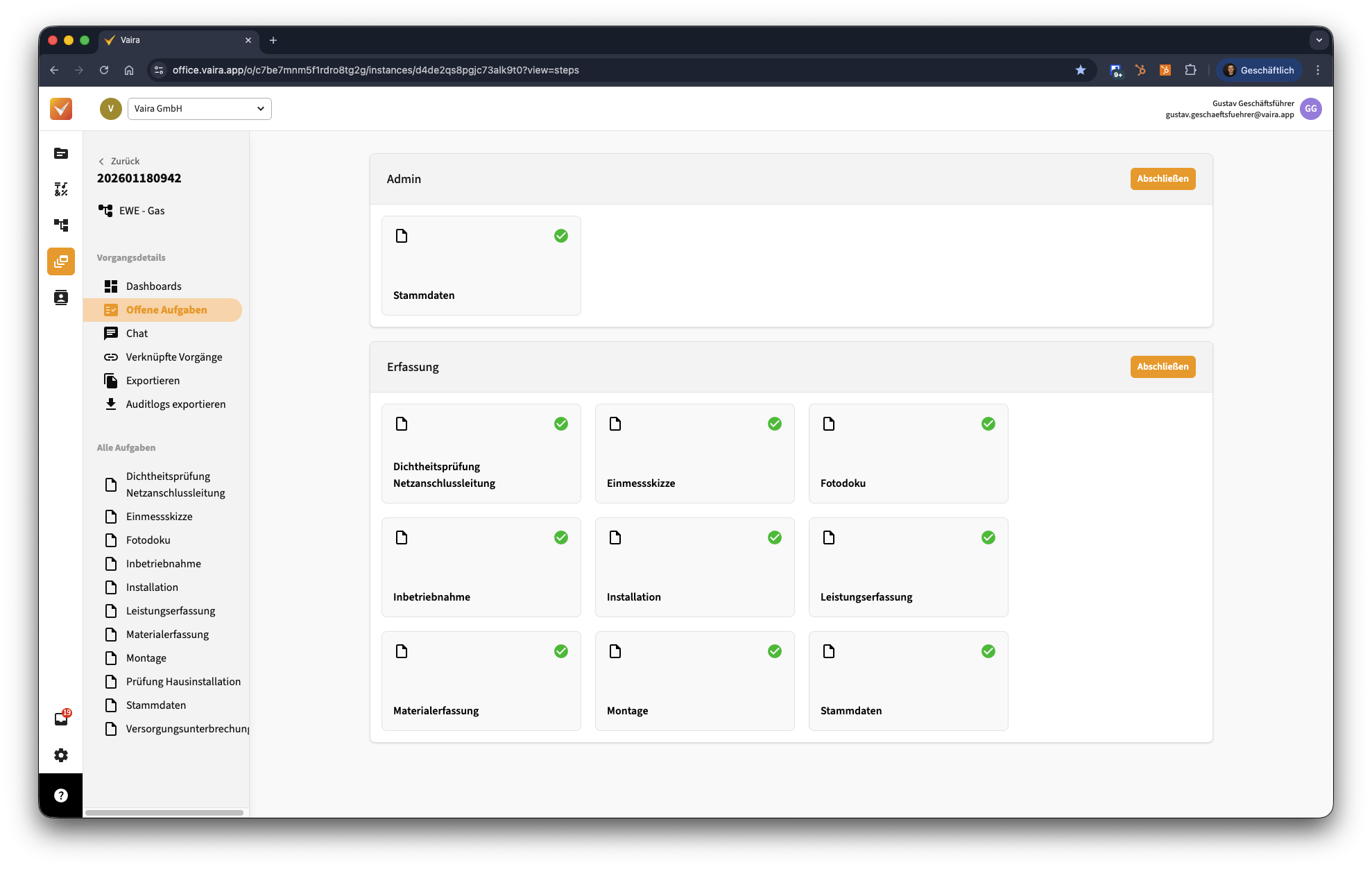 Unter dieser Überschrift findest du alle Aufgaben, die Teil dieses Vorgangs sind. Du kannst diese Aufgaben anklicken, um ihre Inhalte anzusehen. In dieser Ansicht kannst du allerdings keine Änderungen vornehmen – das geht nur im passenden Schritt über die Option Offene Aufgaben. Wie du Aufgaben bearbeiten kannst, erfährst du in diesem Artikel: Wie kann ich Aufgaben im Vaira Office bearbeiten?