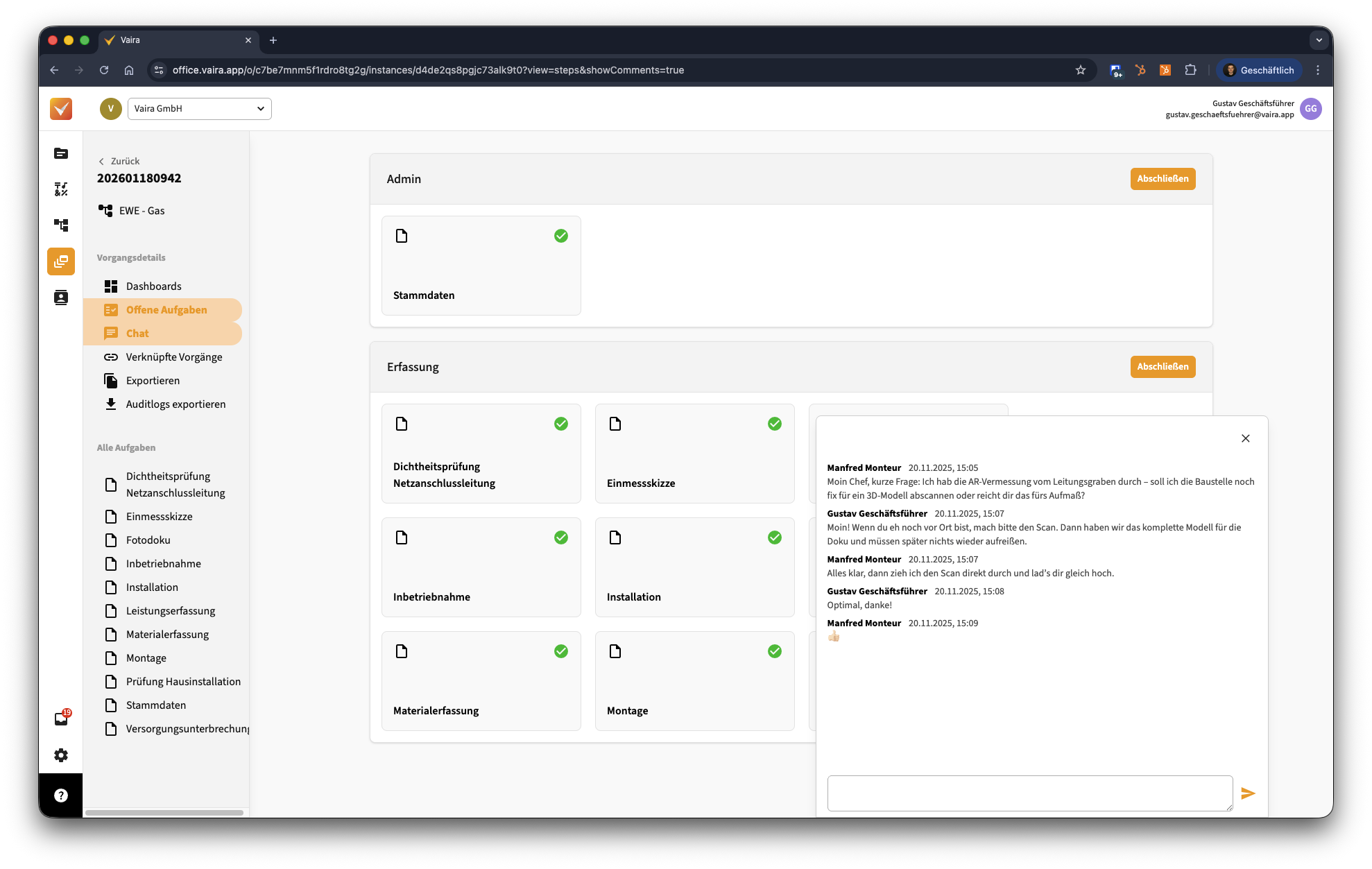 Darunter folgt im Beispiel "EWE – Gas" mit unserem Workflow-Symbol davor. Hier siehst du immer, aus welchem deiner Prozesse heraus dieser Vorgang erzeugt wurde. Du kannst auch auf diese Information klicken, um direkt zum Workflow zu gelangen.